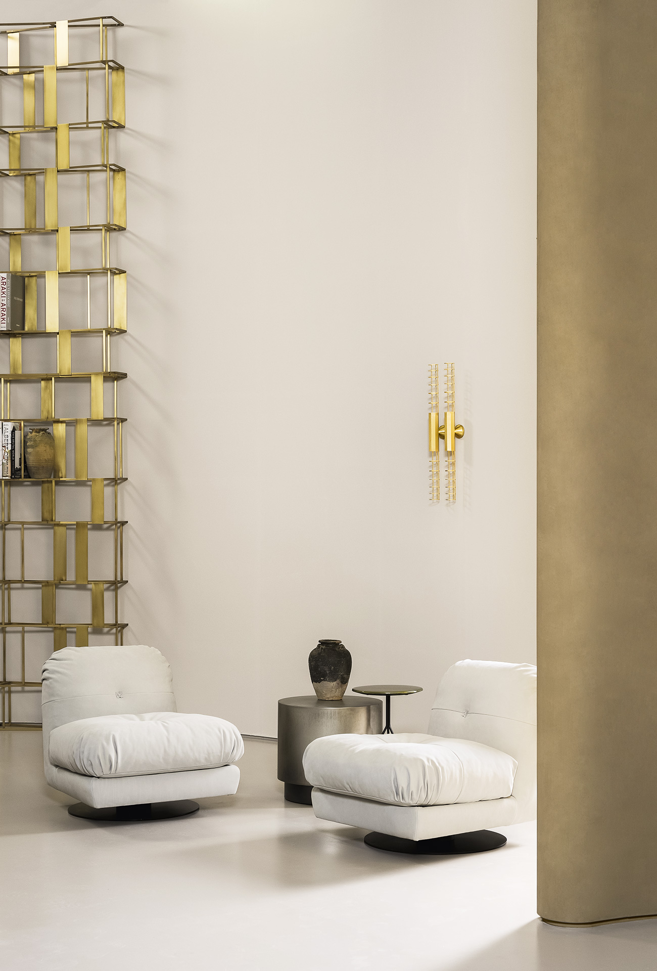 Structure in phenolic plywood and fir essence. Differentiated density polyurethane foam filling with acrylic fibre covering. Decoration with same colour leather and matching or white/red yearn. Sofa and asymmetric armchair with base in matte black-varnished tulipier wood. Armchair with revolving base in matte blackvarnished metal.