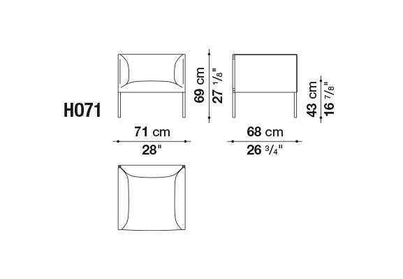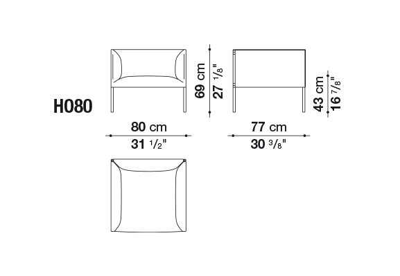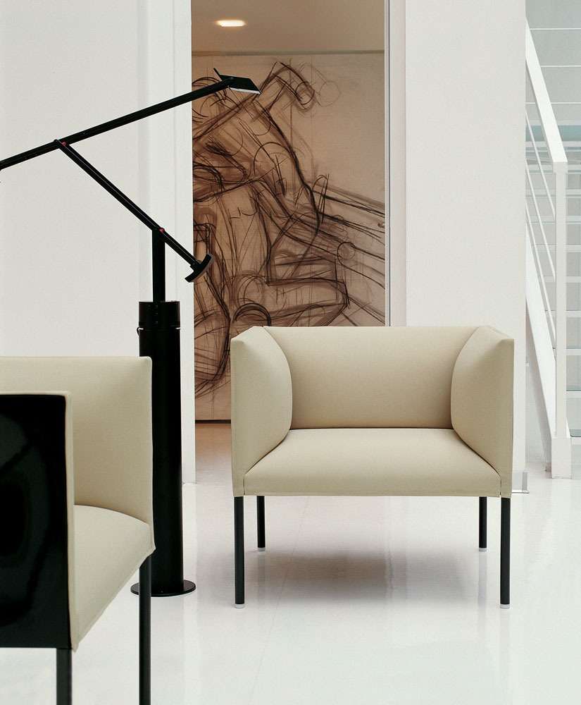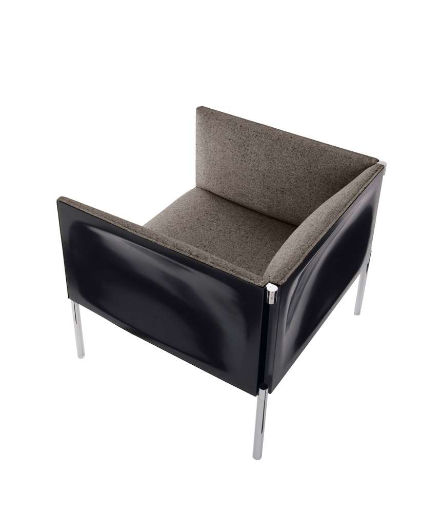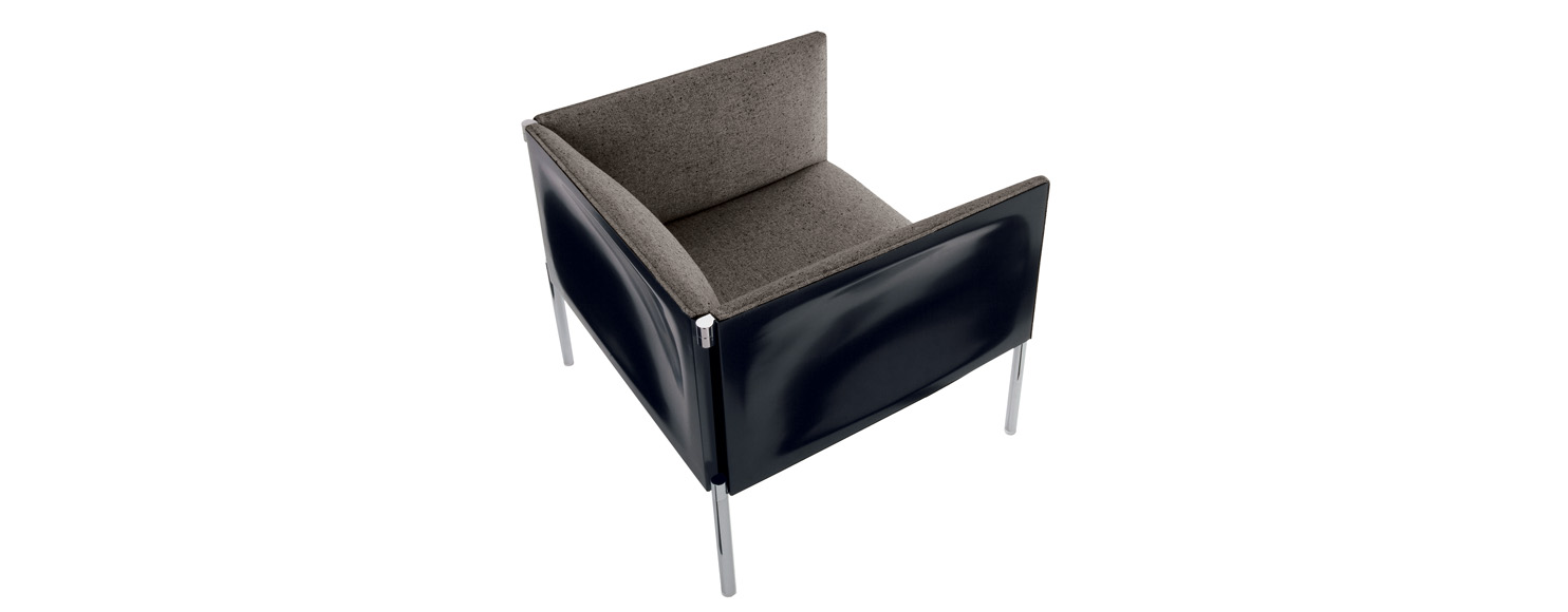 源自這個(gè)系統(tǒng)的各種類型包括一把扶手椅和一個(gè)有兩種尺寸的小型雙人沙發(fā),以及一個(gè)有兩種尺寸的小型三人沙發(fā)。這個(gè)項(xiàng)目是由一組大小不一、模塊化的面板打造而成。它們能夠通過鉸鏈組裝起來,成為靠背和扶手并支撐柔軟的座椅。整個(gè)有填充且?guī)в袃?nèi)襯的面板在外部呈現(xiàn)出一種凹陷的塑料表面,這讓各種元素在視覺上都消失了,更加凸顯了其輕盈的效果。