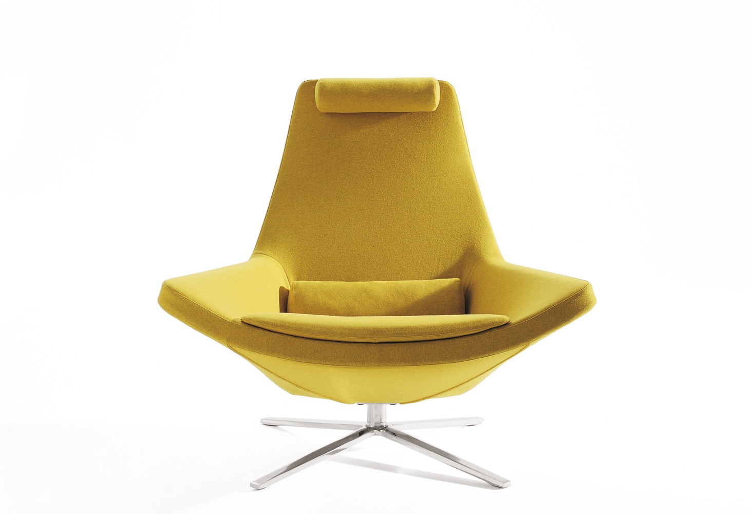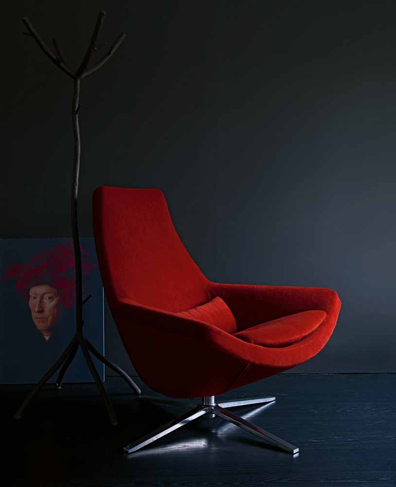座椅與扶手之間的流暢連接是這款小扶手椅和休閑椅的主要標志。小扶手椅擁有鋁制旋轉底座和4根輻條,將優雅與舒適結合在一起。休閑椅體積較大,也有旋轉底座,還有匹配的擱腳凳,和一個帶磁鐵、可調整的頭枕。有兩種底座可選,一種帶有4根輻條,一種是圓形的,它們都是由拋亮光的鋁制成。
