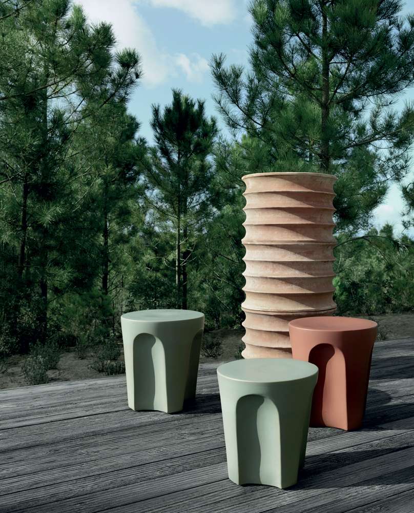 In 2020 Colosseo debuts outdoor in the new porcelain stoneware version in sauge and clay colors. A furnishing element with various functions depending on the occasion and need (coffee table and pouf). Colosseo takes its name from the designer’s inspiration. Naoto Fukasawa has in fact arrived at the desired shape thinking of a solid in the shape of an upside-down truncated cone, creating an assonance with the structure of the famous Roman arena.