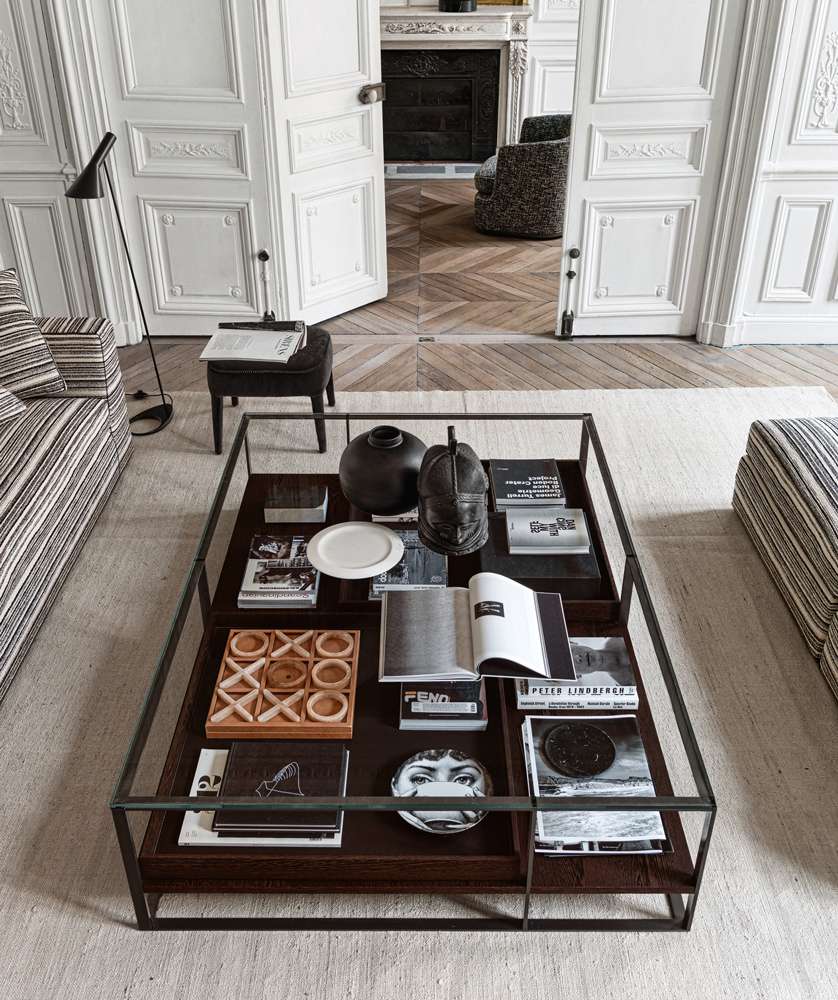 A series of cabinets display elements and low tables destined to safeguard and exhibit the most precious objects with great elegance. Ideal for both homes and commercial spaces, to be placed also in the centre of the room, these pieces allow their contents to be viewed, extracted and repositioned easily with perfect order. Cabinets are available in one size (cm.180x50x80h.) and in three different versions with extractable trays and drawers; the low tables are available in two versions (cm.90x130x43h. and cm.180x130x43h.), both with extractable trays. The entire range pairs tops in transparent extra clear glass with painted metal structures in sophisticated colours bronzed nickel, black chrome, graphite and amber. Shelves, drawers and extractable trays - the latter featuring a leather lining in colonial or dark brown leather - are available in natural wenge and oak in the different options in the collection brushed light, brushed black, grey, smoked oak.
