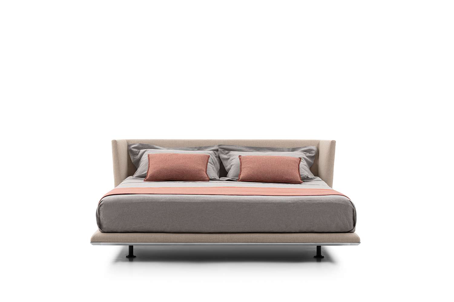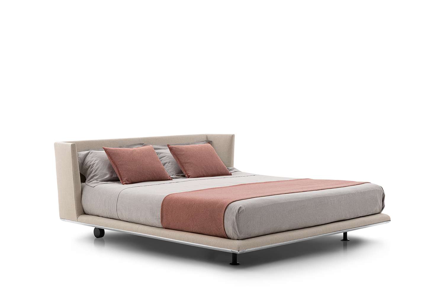 A brand new element in the Noonu archipelago is the bed. Its lines echo the design of the sofa, in particular the headboard, an element that instantly stands out for its understated grandeur, attracting the eye and enveloping the body. In pure Noonu style, the underlying frame is slightly suspended off the ground as if floating on the floor. At the base of the bed we find the usual metal profile in curved aluminium, available in bright brushed, black chromed and pewter grey versions. As with the whole Noonu range, the bed can be covered in leather or fabric. For ease of movement, the bed can rest on four fixed feet or on two fixed feet and two wheels, positioned inside the frame to remove them from view.