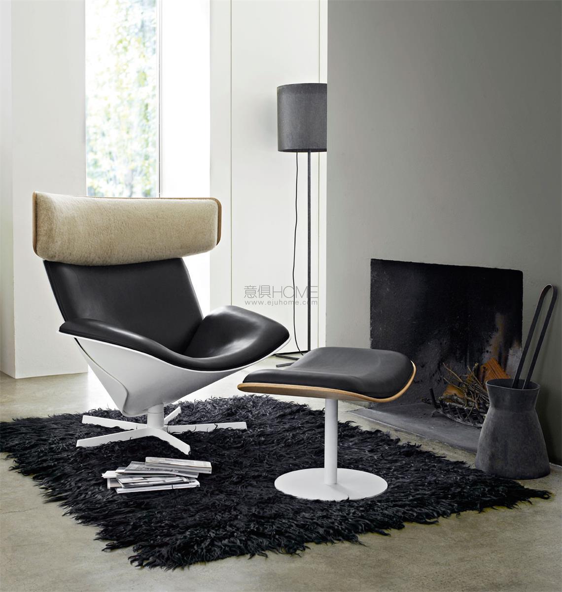 這款轉椅專注于放松休閑,它包含兩個圓錐形玻璃纖維外殼:一個將底座和靠背連接在一起的座椅。頭枕是一塊帶有弧度的橡木,內部有填充物,并從靠背上向外伸出。這款椅子的突出之處是它在眾多不同元素、材料和皮革飾面之間找到了平衡——還可以選擇用美利奴羊毛作為頭枕的材料。