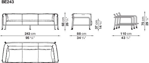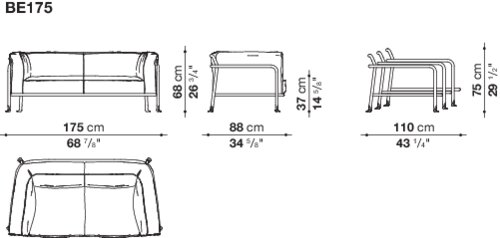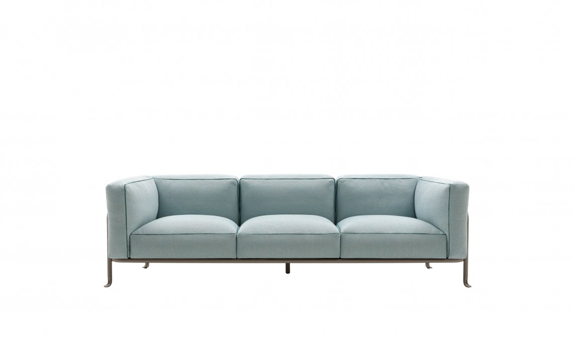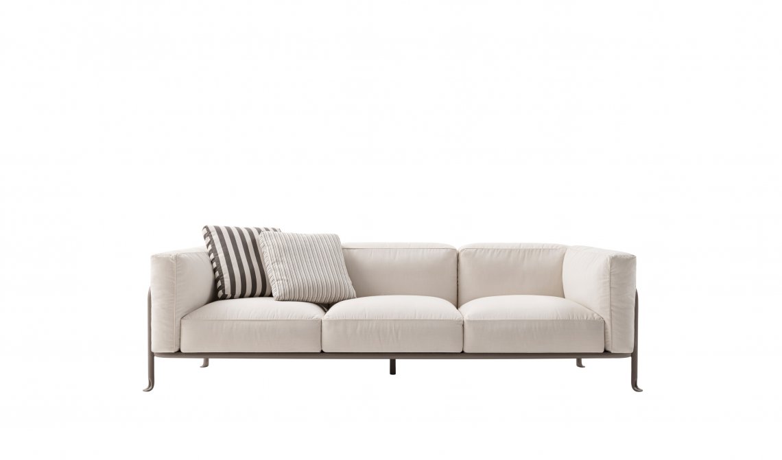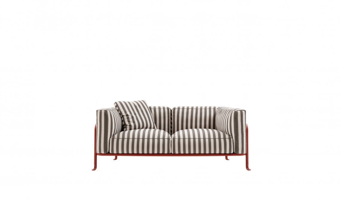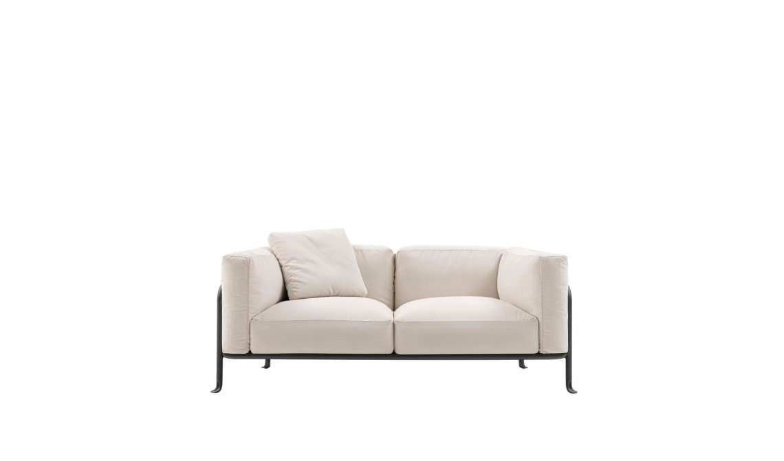The outdoor Borea two-seater and three-seater sofas feature a tubular metal frame with a fluid and seamless design, without joints and interruptions, and an unexpected motif in the end part that rests on the ground. The metal bending processes used exploit techniques typically used in the aeronautical sector and transport them into the world of outdoor furniture, giving life to a collection with an unmistakable style. Comfort is ensured by generous, welcoming cushions, which are not only soft and relaxing but also developed to be sustainable: the paddings are made from 100% polyester fibre obtained from recycled PET plastic bottles, enveloping a polyurethane core in diversified densities. 510 1500 ml bottles are needed to create the upholstery for a Borea three-seater sofa, and 390 bottles for the two-seater sofa.