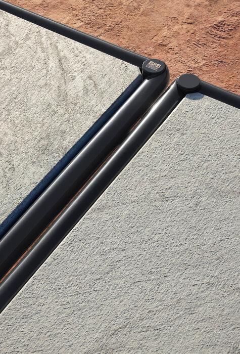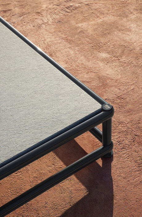 A low table with a linear design underlined by tubular elements in recycled aluminium. It is available in a square or rectangular version with tops in serpentine stone or in enamelled lava stone in different colours to match the semi-gloss finishes of the structure.