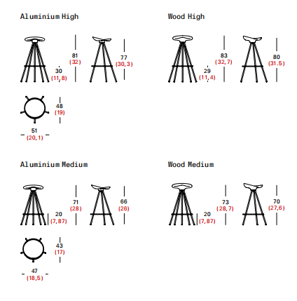 anodizado plata o mecanizado en haya maciza barnizada. Versión taburete bajo con ruedas.Para los modelos de