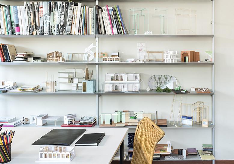 Estantes y soporte vertical en extrusión de aluminio, cepillado y anodizado plata. Herrajes de sujeción en