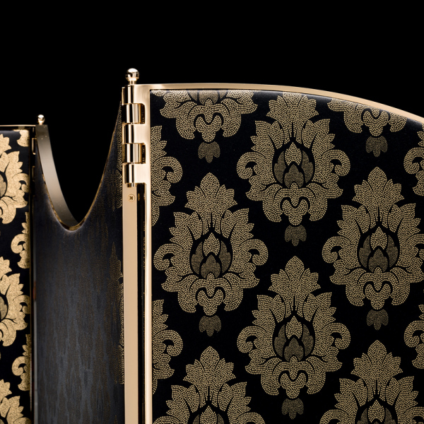 polyurethane, upholstered in fabric. Metal frame in polished gold finishing.
