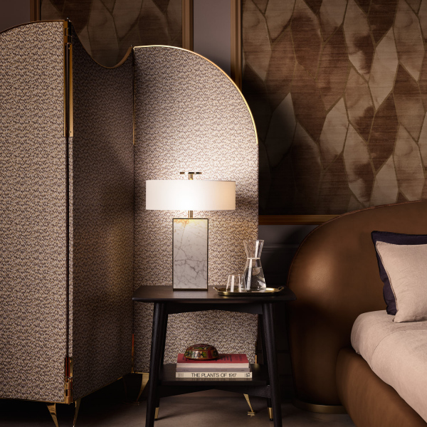 Paravento con struttura realizzata in multistrato di faggio, ricoperto con poliuretano e rivestito in tessuto.
