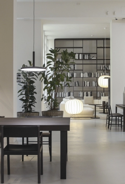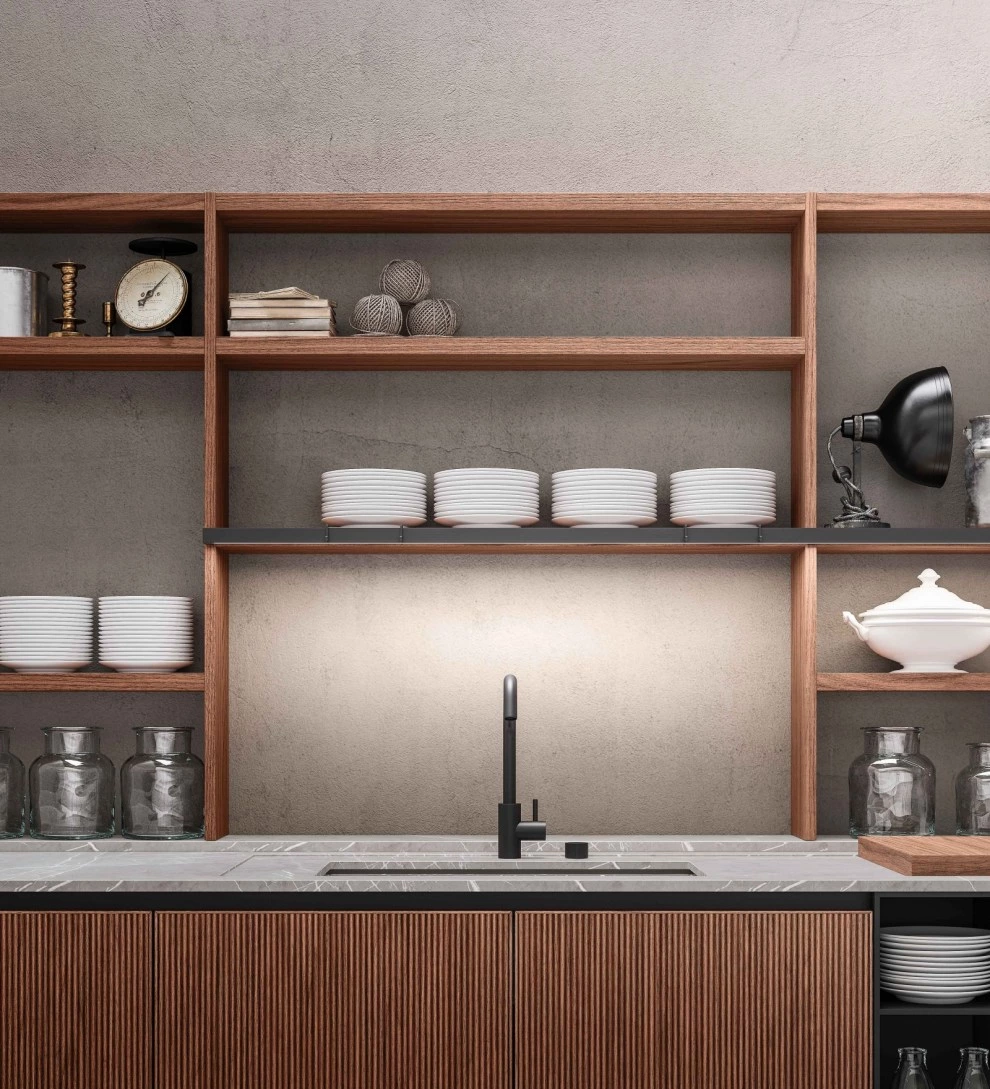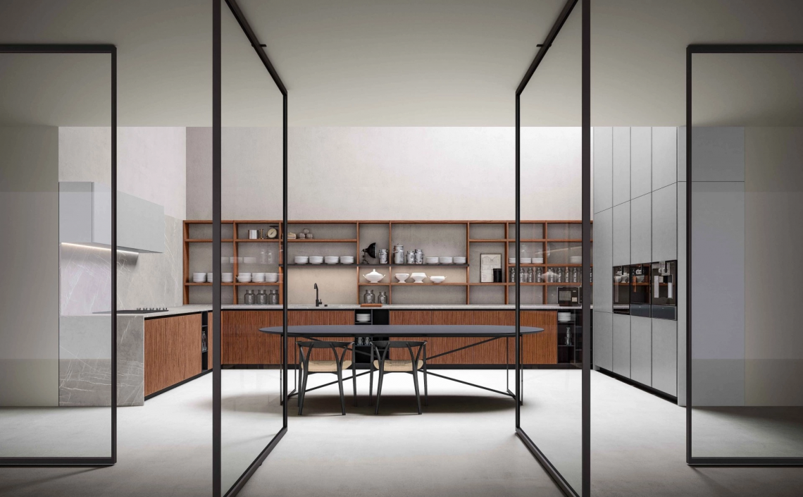 New shelving -bookcase system, characterised by same vertical and horizontal thicknesses as Antibes and by flexible shelves, available in different width and positioned at different height, both in veneered wood and matt lacquer