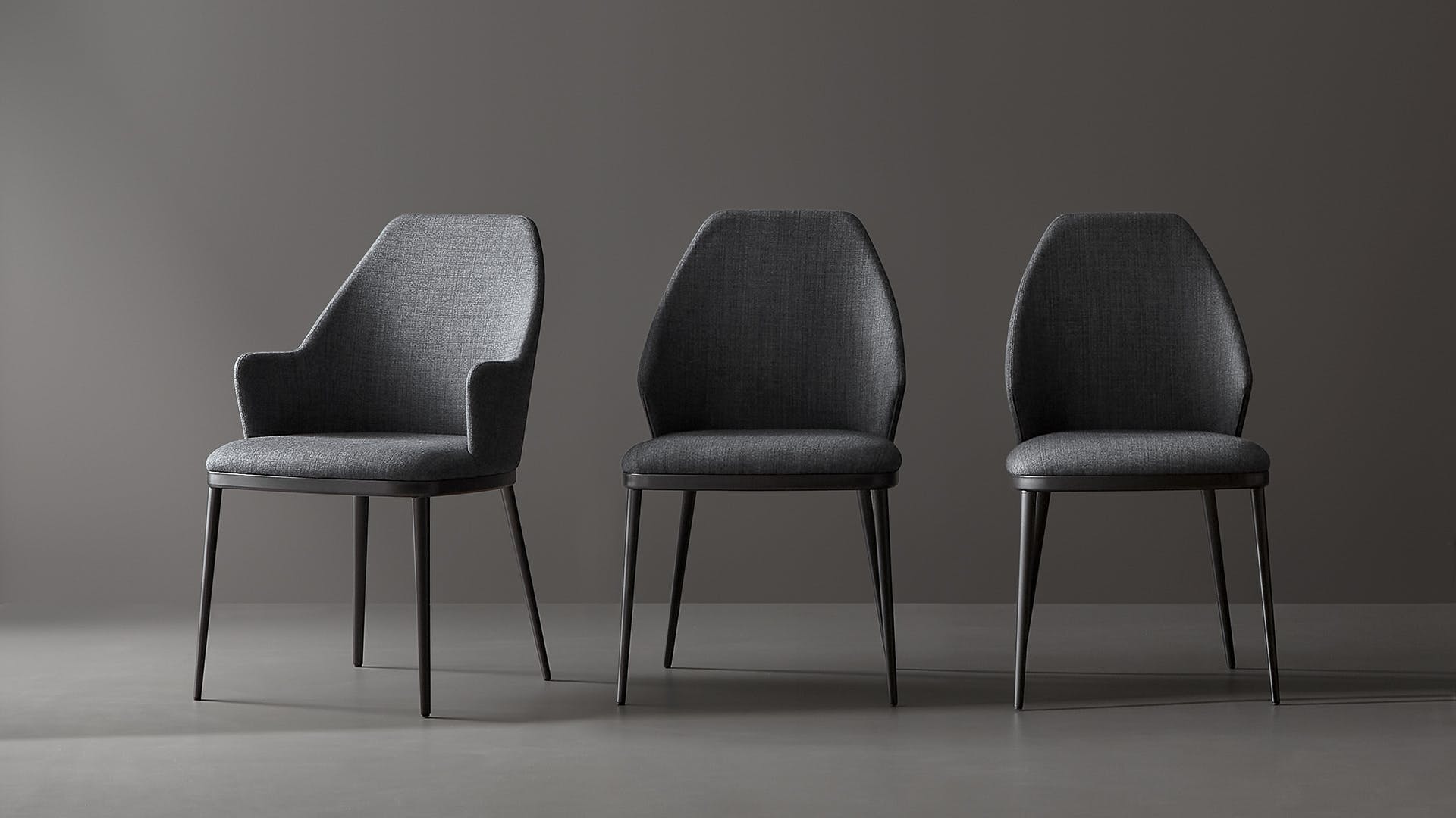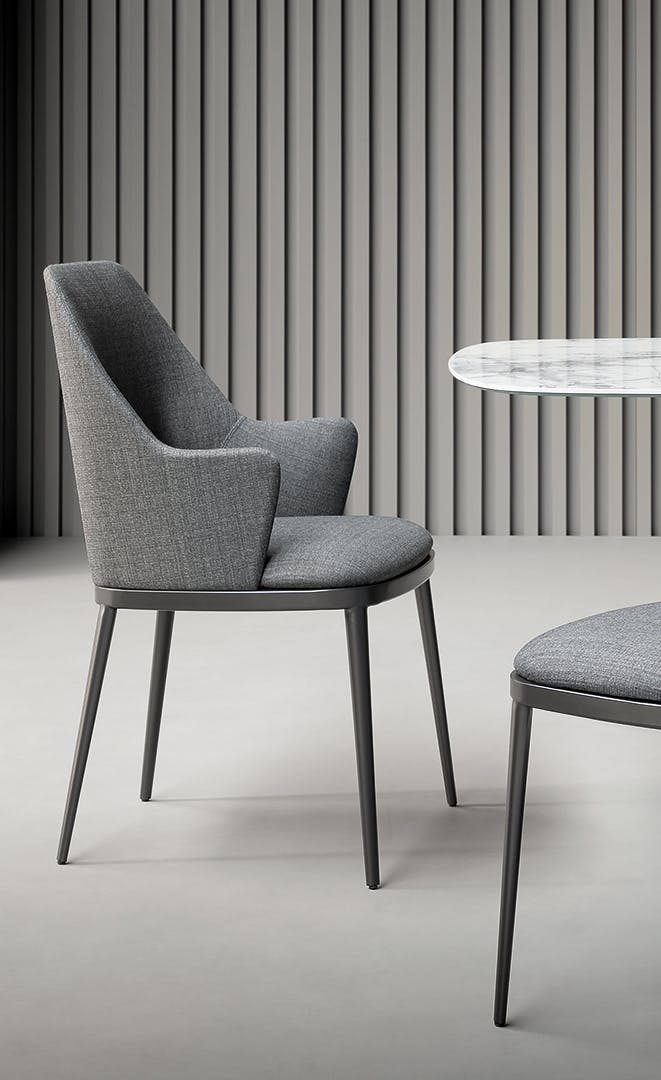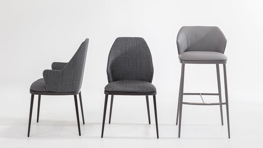 The Mida collection is named after the mythical King Midas who turned everything he touched into gold. Similarly, Mida seating adds a touch of style to any space, featuring a backrest with a generous, enveloping shape and a metal base that gives the structure a harmonious design. The soft padding of the seat and backrest, combined with the exquisite upholstery offered by Bonaldo, make Mida the ideal element to position in a living area, around a table or in the Mida too stool version, in front of a bar top. The Mida modern high back chair design collection includes a chair (Mida), a chair with armrests (Miss Mida), a version with a wider seat (Mida large) and a stool (Mida too) in two different heights.