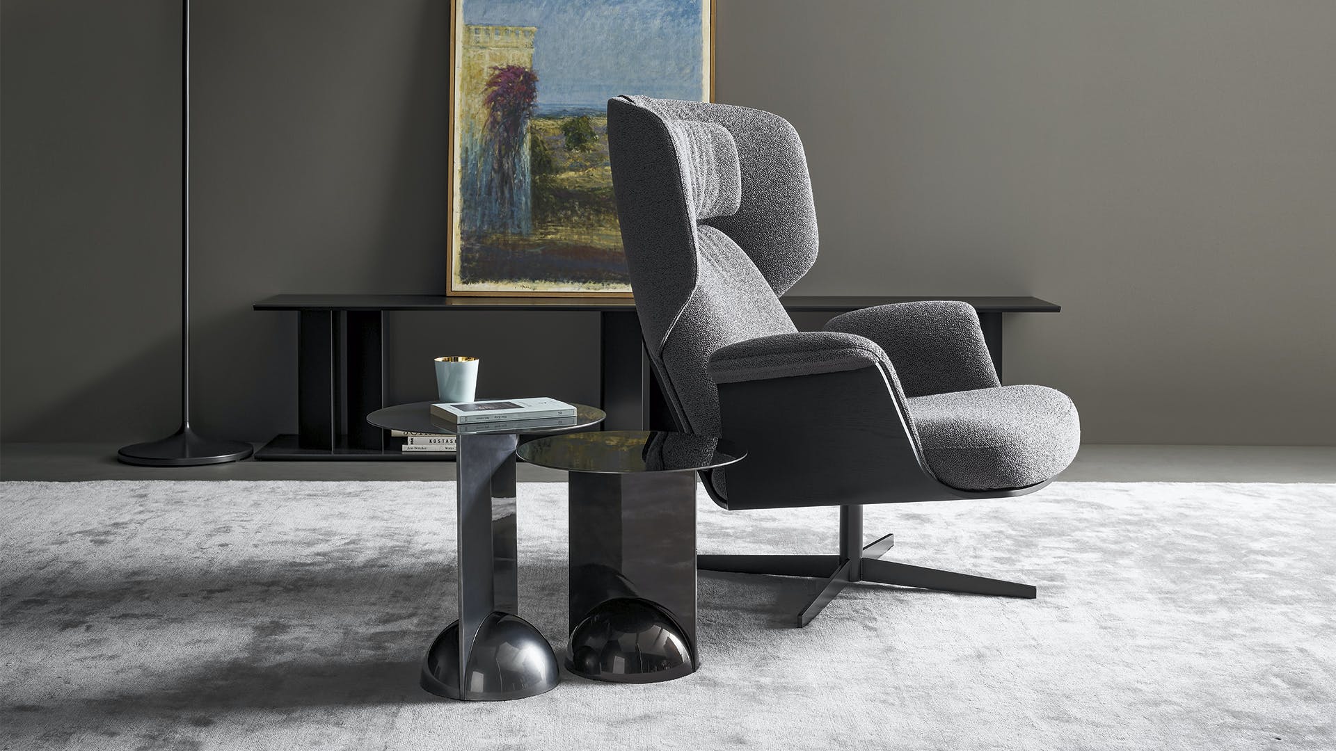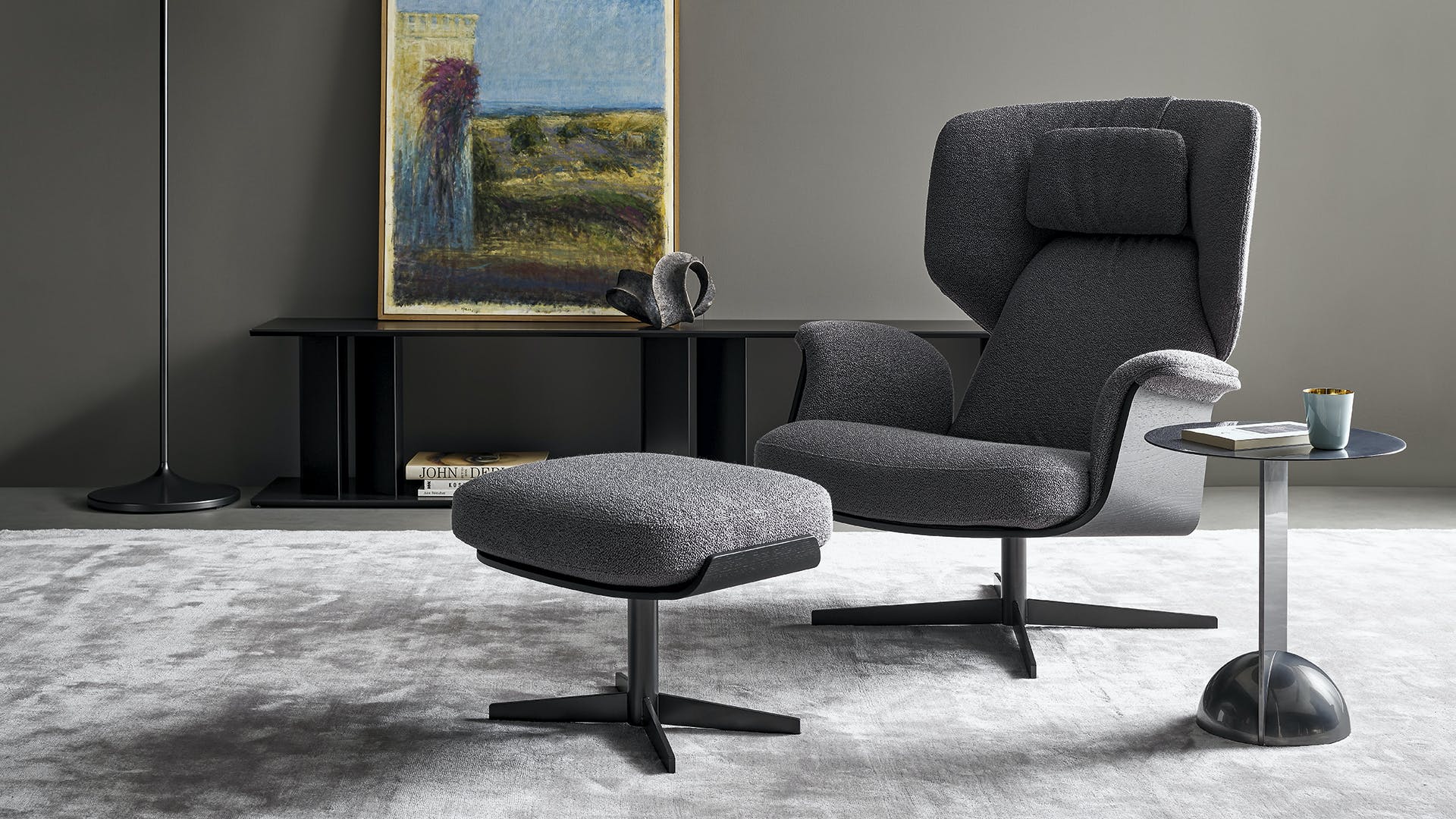 The Olos bergère armchair combined with the Olos footstool complements the Olos collection helping to make it both coordinated and harmonious. The new bergère design armchair offers considerable levels of relaxation, characterized by contours that indicate a lifestyle that is elegant, rigorous, serene and casual all at the same time, presenting a reinterpretation of mid-century modern design that reminds us of the authenticity of curved lamellar woodworking. Like a protective shell, the gentle smoothness of the curves of the supporting wooden frame combines with the sinuous roundness of the padding, making the generous level of comfort on offer evident at first sight, welcoming you enticingly with its essential forms.