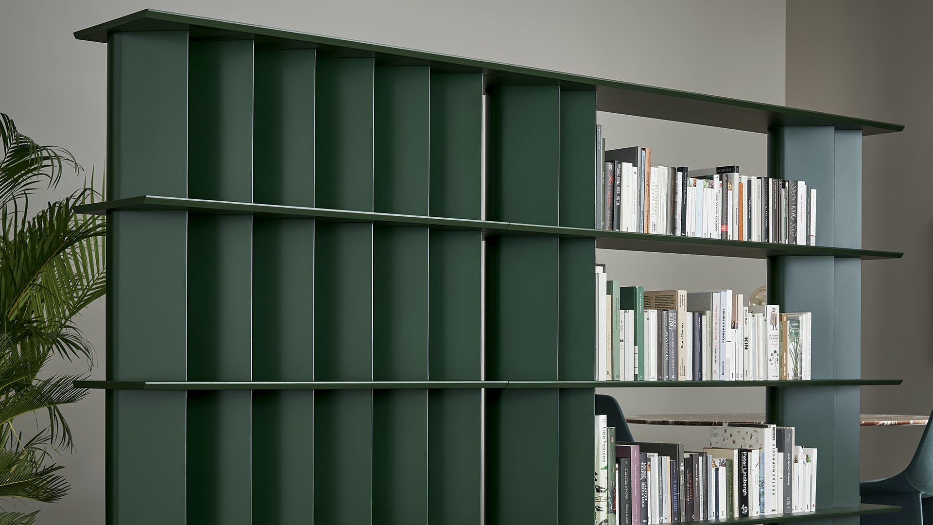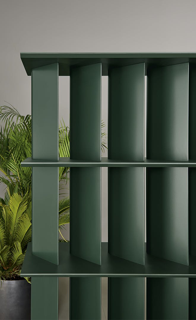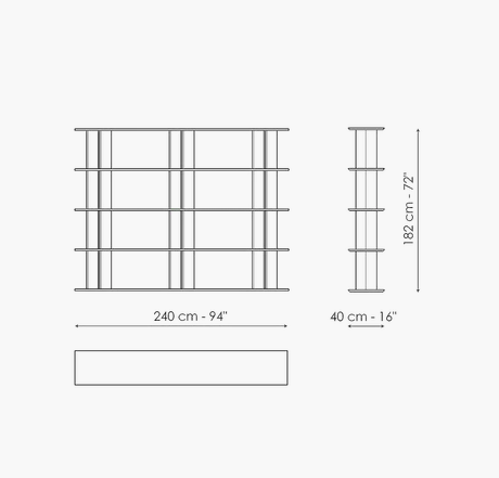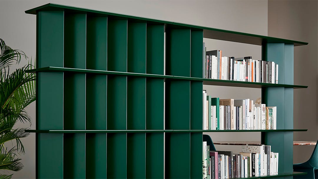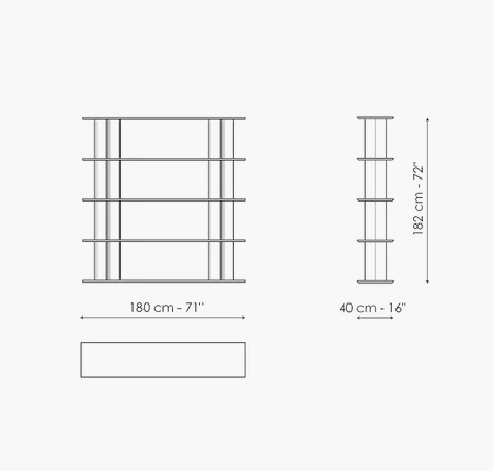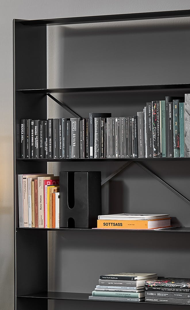 The idea behind these bookshelves is that of playing with shapes and juxtaposing different modules to create a variety of visual effects. The Dogma modern bookshelves are designed around a basic element, namely the tear-drop-shaped uprights which change the visual perception. The design thus becomes rounded and soft or sharper and narrower depending on the angle from which it is viewed. The Dogma collection has three different modules which can be combined at will. They feature different spacing between the uprights, which when placed side by side, allow different combinations to be created. The Dogma furniture bookshelves can be placed along a wall or free-standing in the centre of the room acting as a partition between two areas. The Dogma bookshelves are available with Canaletto walnut or coal oak shelves combined with metal uprights, or in a single colour version.