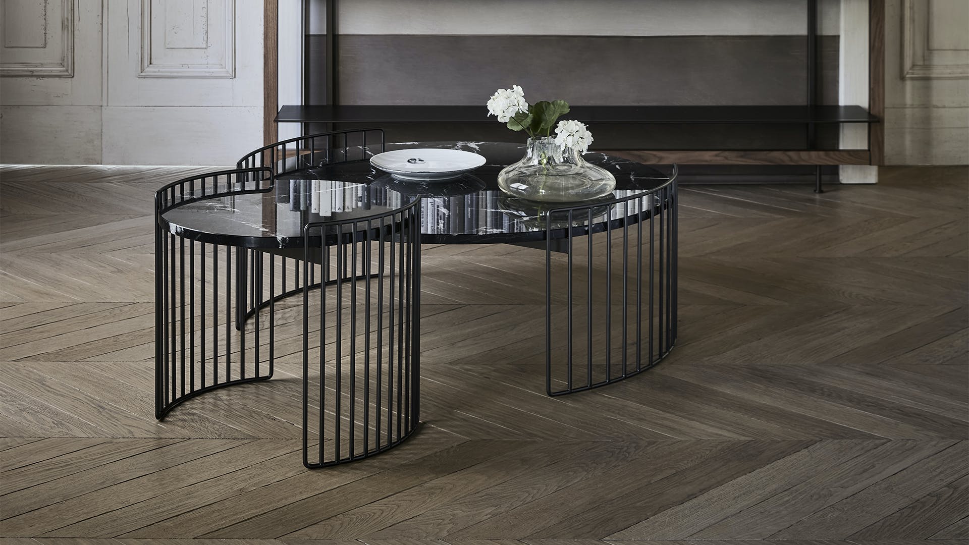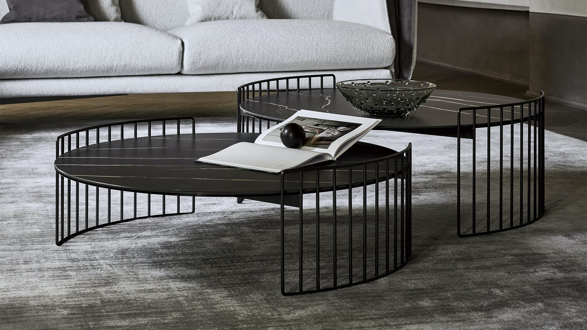 Harpe coffee tables, while decorating the living room, are practical storage areas which elegantly enhance the living room on their own or in combination. The collection of Harpe coffee tables is inspired by the strings of a harp from which they take their name: the base is visually light and encircles the top, available in various materials from marble to ceramic, as well as metal and glass. With their different heights and dimensions and different available tops, the Harpe round coffee tables for living spaces can adapt to every living room, both when placed alone and when combined.