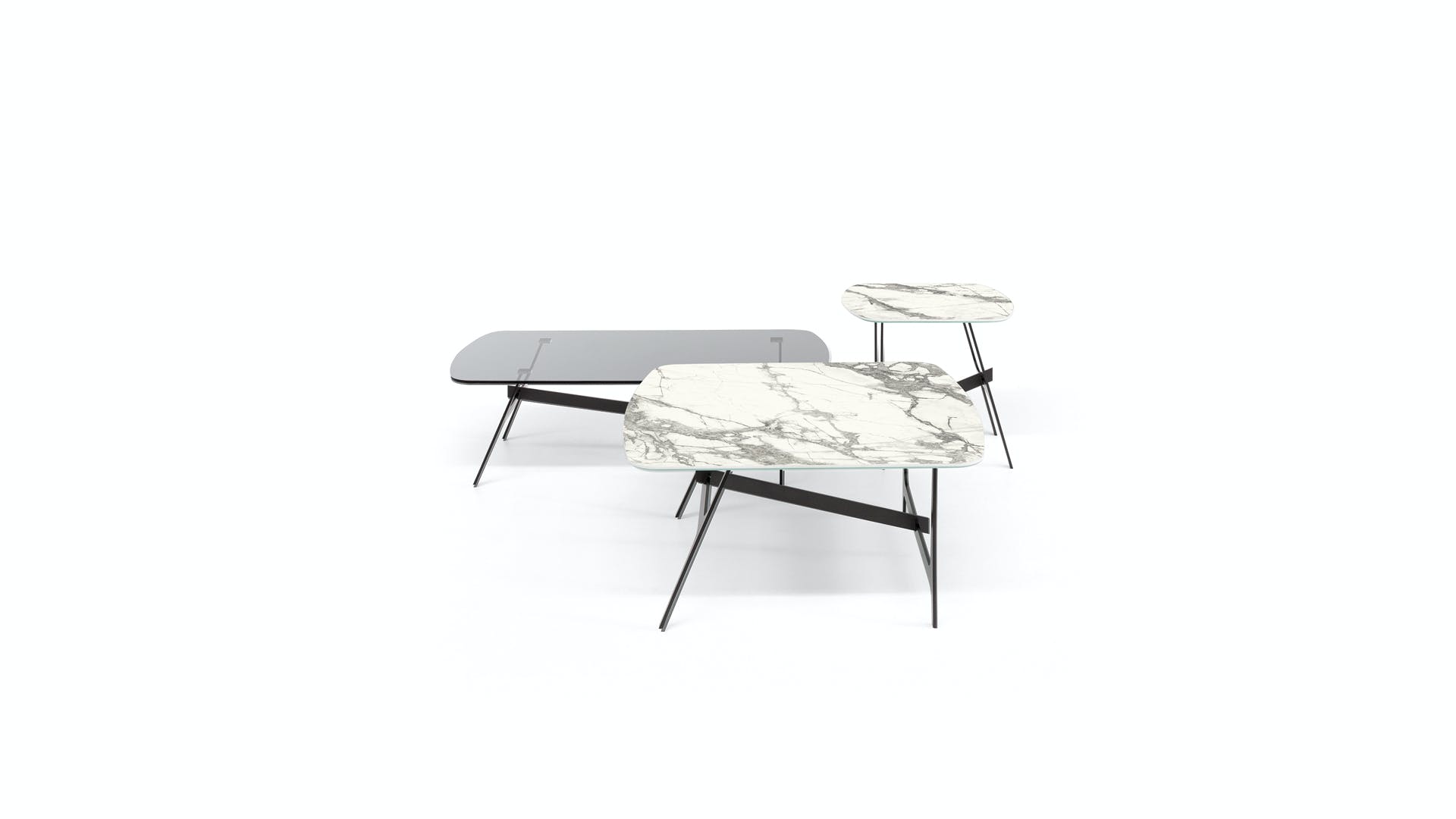 For this collection, designer Giuseppe Viganò has drawn inspiration from the world of geometry, from which he has borrowed different shapes and harmonized them in a single design. The collection of living room sofa side tables plays with minimal shapes expressed in space: the horizontal top is supported by two stands with a characteristic H shape, one vertical and one slanted, united by a transverse element that conveys a sensation of movement. The legs and central stem are made of metal, while the top with rounded corners is available in numerous ceramic and crystal finishes, creating combinations of materials that are always different and can respond to any furnishing and style requirement.
