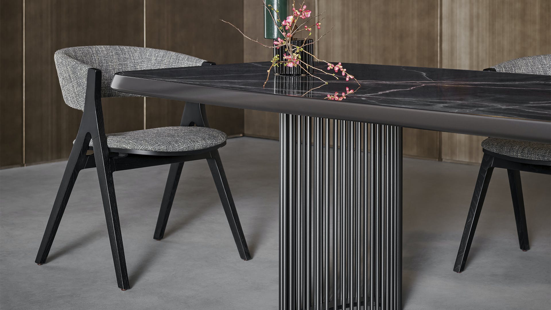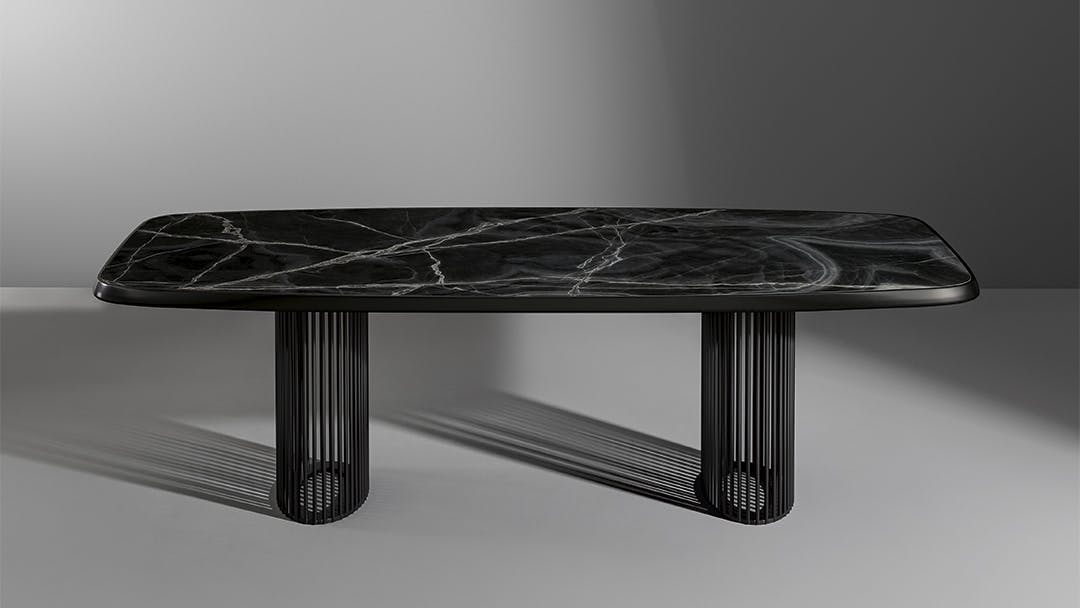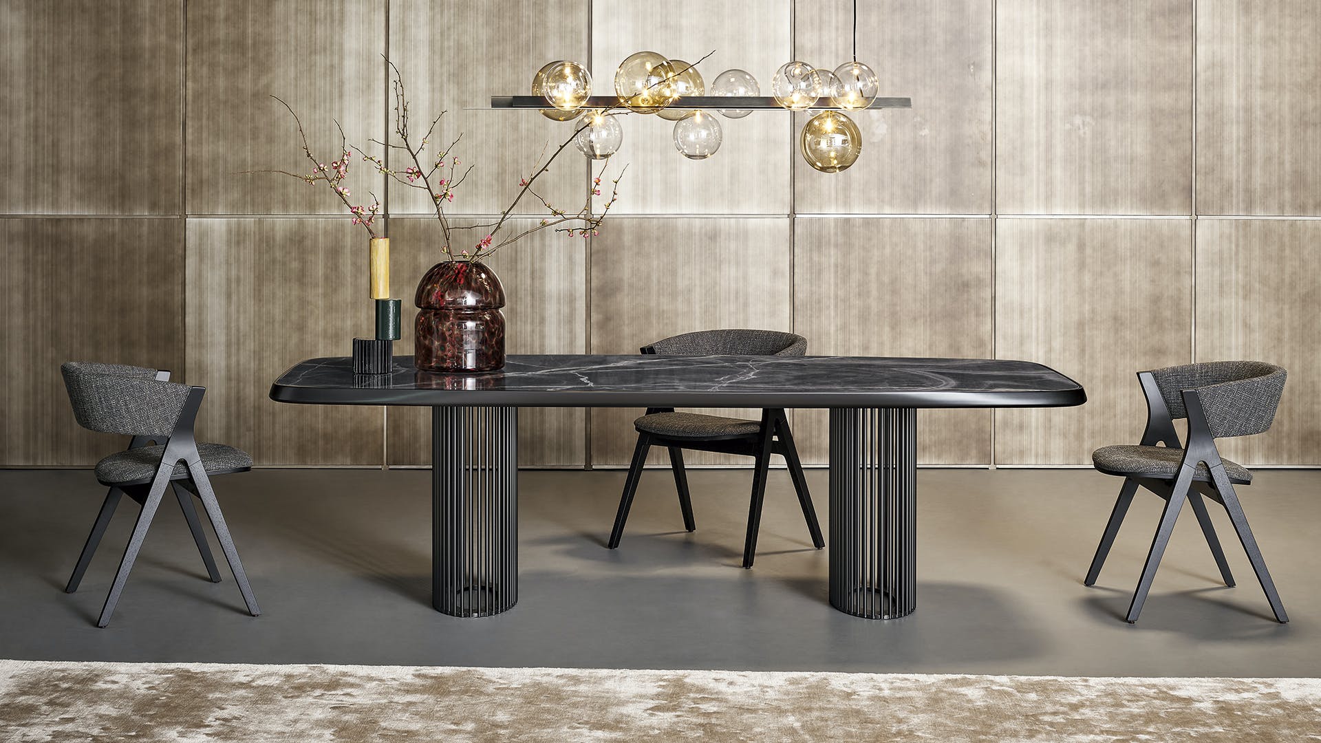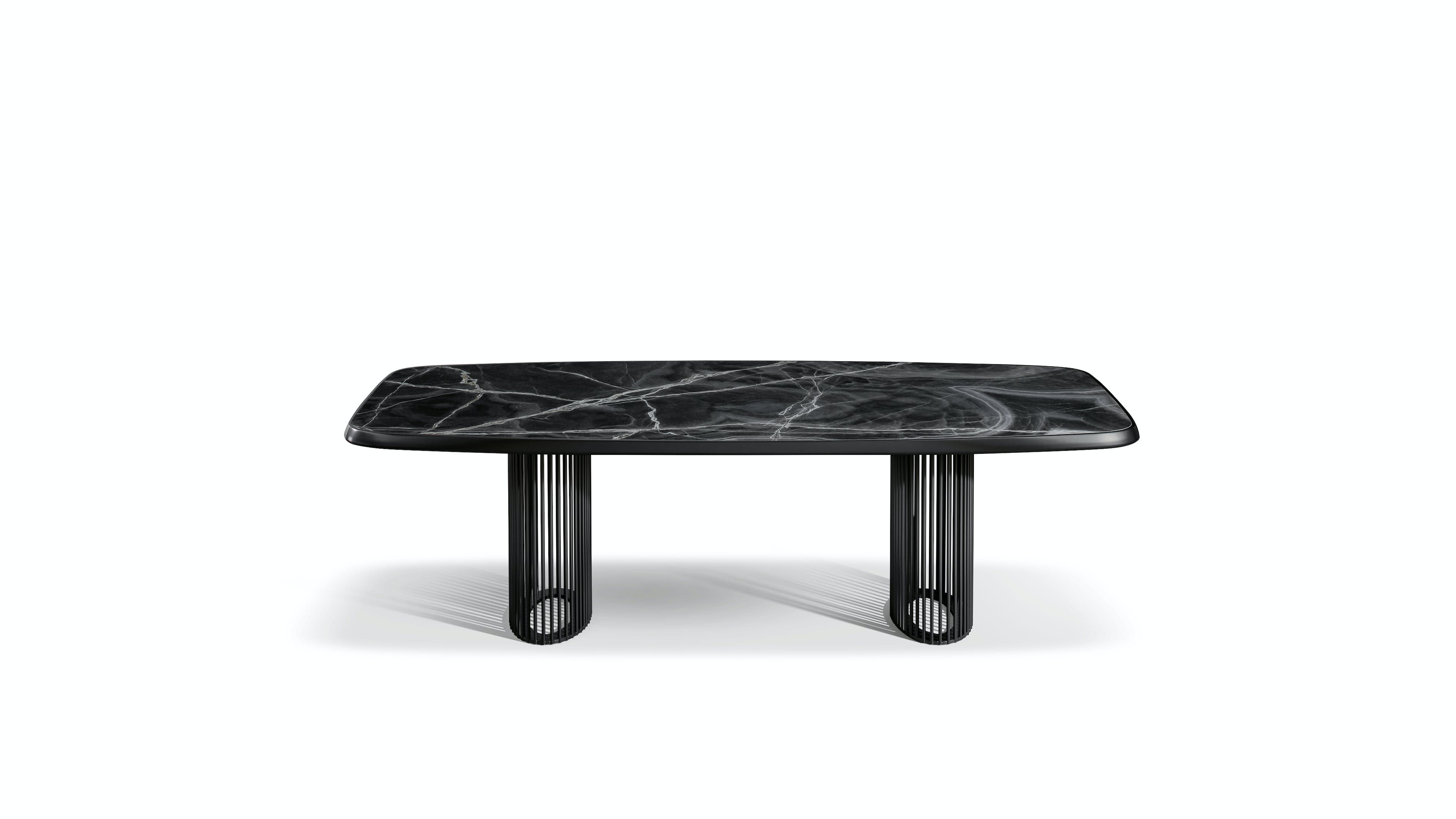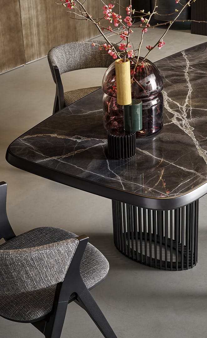 The image of a sailing boat rocking gently on the moonlit sea was the inspiration behind the design of Luna Bianca, the new modern dining table designed by Toshiyuki Yoshino. Seemingly linear, the top is made in ceramics and stands out for its edge with a lead or bronze finish that runs all around the perimeter, gently mirroring the inclination and thereby creating an elegant yet soft curve, like the hull of a sailing boat. The base consists of two “cage-style” structures shaped through a harmonious rhythm of slim metal tubes which, moving playfully between solids and voids, lightens this enchanting design table while at the same time giving a feeling of solidity and robustness.