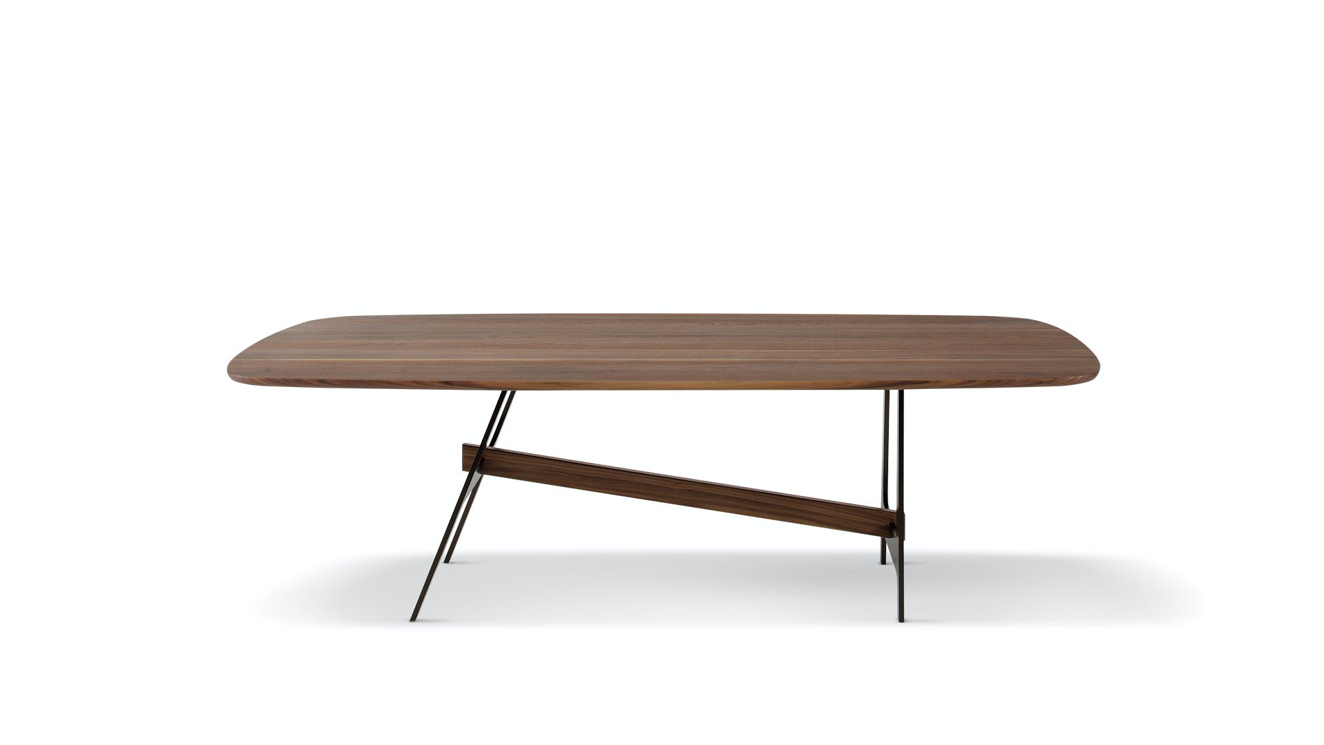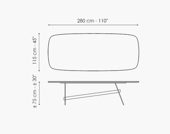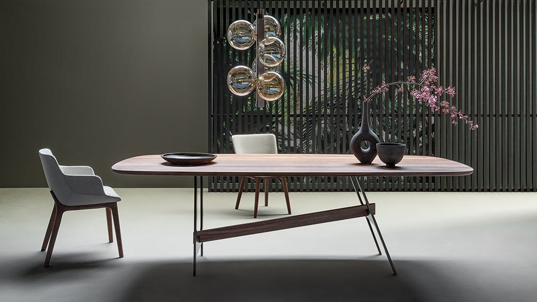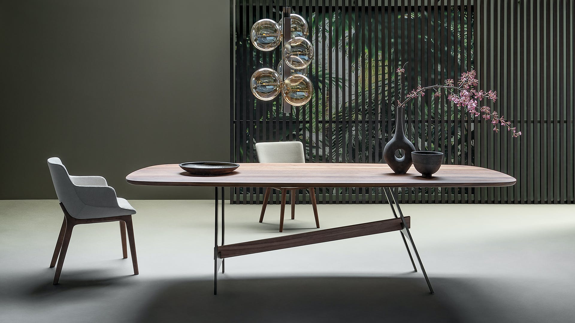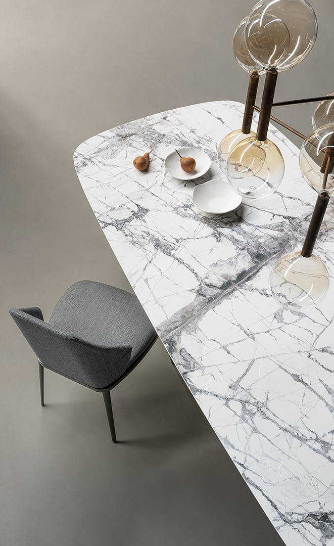 The Slot modern dining table embodies the extensive formal and technological research that has always underpinned Bonaldo's products. For this collection, designer Giuseppe Viganò has drawn inspiration from the world of geometry, from which he has borrowed different shapes and harmonized them in a single design. The collection plays with minimal shapes expressed in space: the horizontal top is supported by two supports with a characteristic H shape, one vertical and one slanted, united by a transverse element that conveys a sensation of movement. The legs and central stem are made of metal, while the top with rounded corners is available in numerous finishes, from wood to ceramic, marble and crystal, creating combinations of materials that are always different and can respond to any furnishing and style requirement.