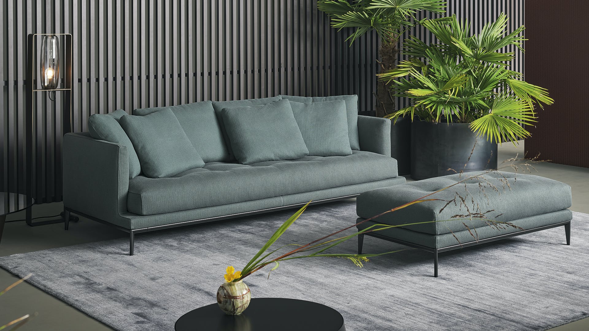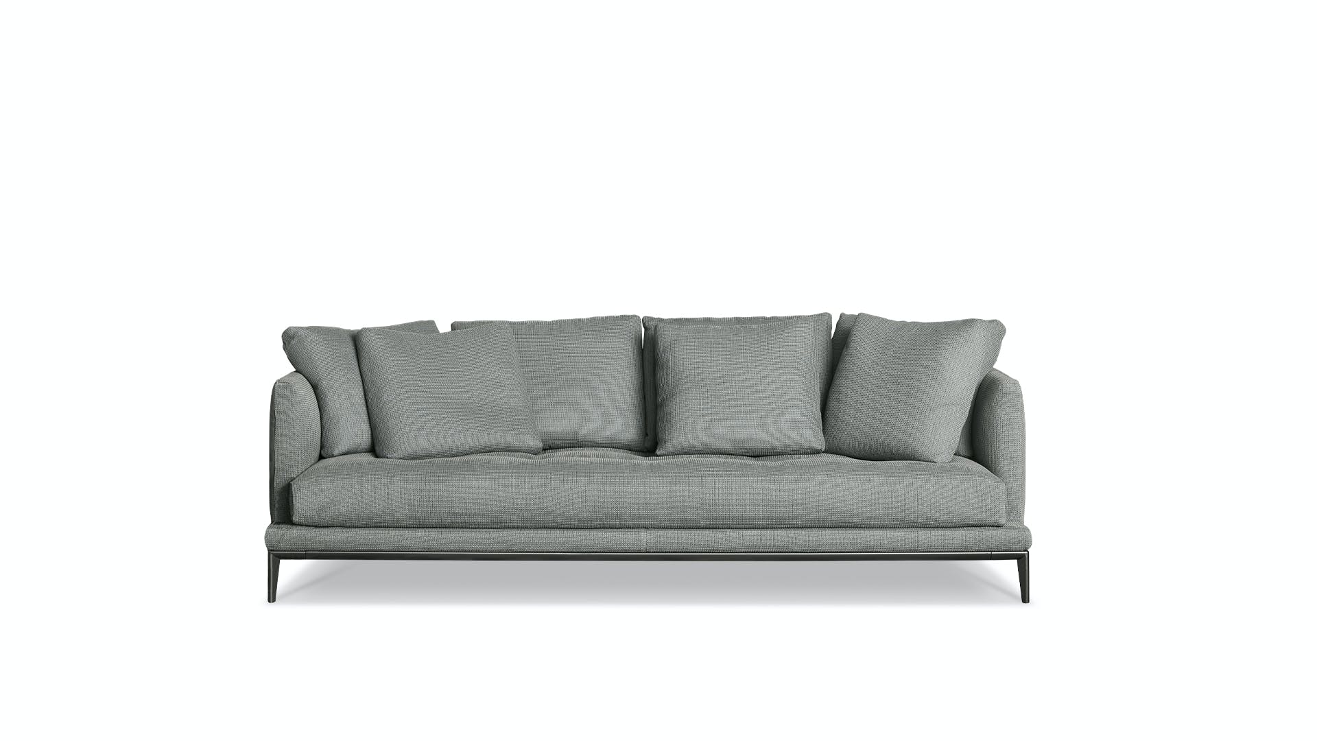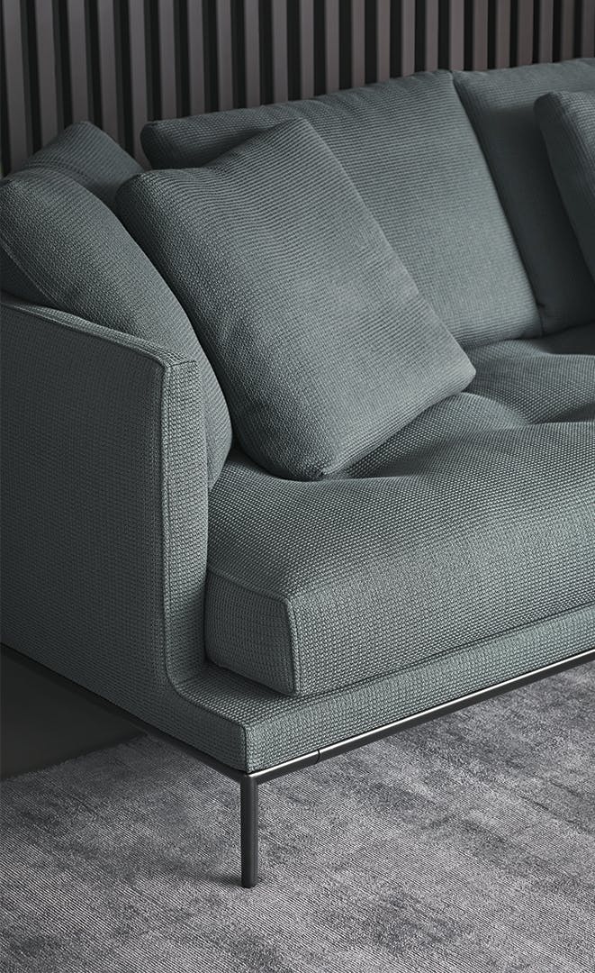 With its slender and minimalist overall image, the Soft Island contemporary sectional modern sofa represents comfort and refuge: with a deep seat, accompanied by a generous amount of cushions, it offers a way of sitting on the sofa that is always customisable. It is possible to choose between several solutions, with linear sofas, poufs, and compositions with corner pieces and chaise longues. The wide body of the Soft Island sofa, with its clean and rigorous lines, accommodates a single long seat cushion, made with stitching that gives movement and elegance. The contrast with the numerous backrest cushions paradoxically enhances the perception of formal simplicity and composed comfort. Soft Island is also available with a metal frame that de?nes the base of the sofa, giving an extra touch of re?nement and elegance. The upholstery of the Soft Island collection is completely removable and is available in fabric or leather. The subtle metal feet slim the composition and lighten its overall image.
