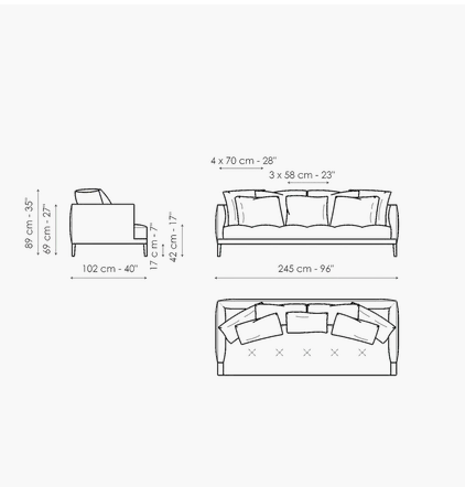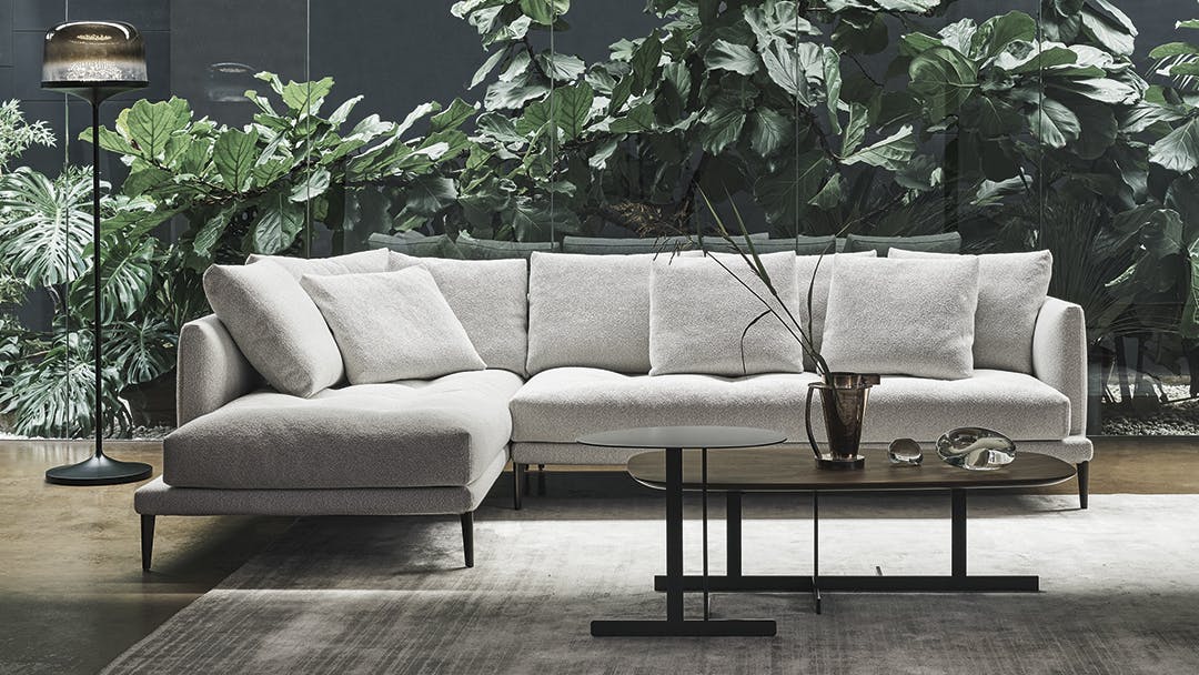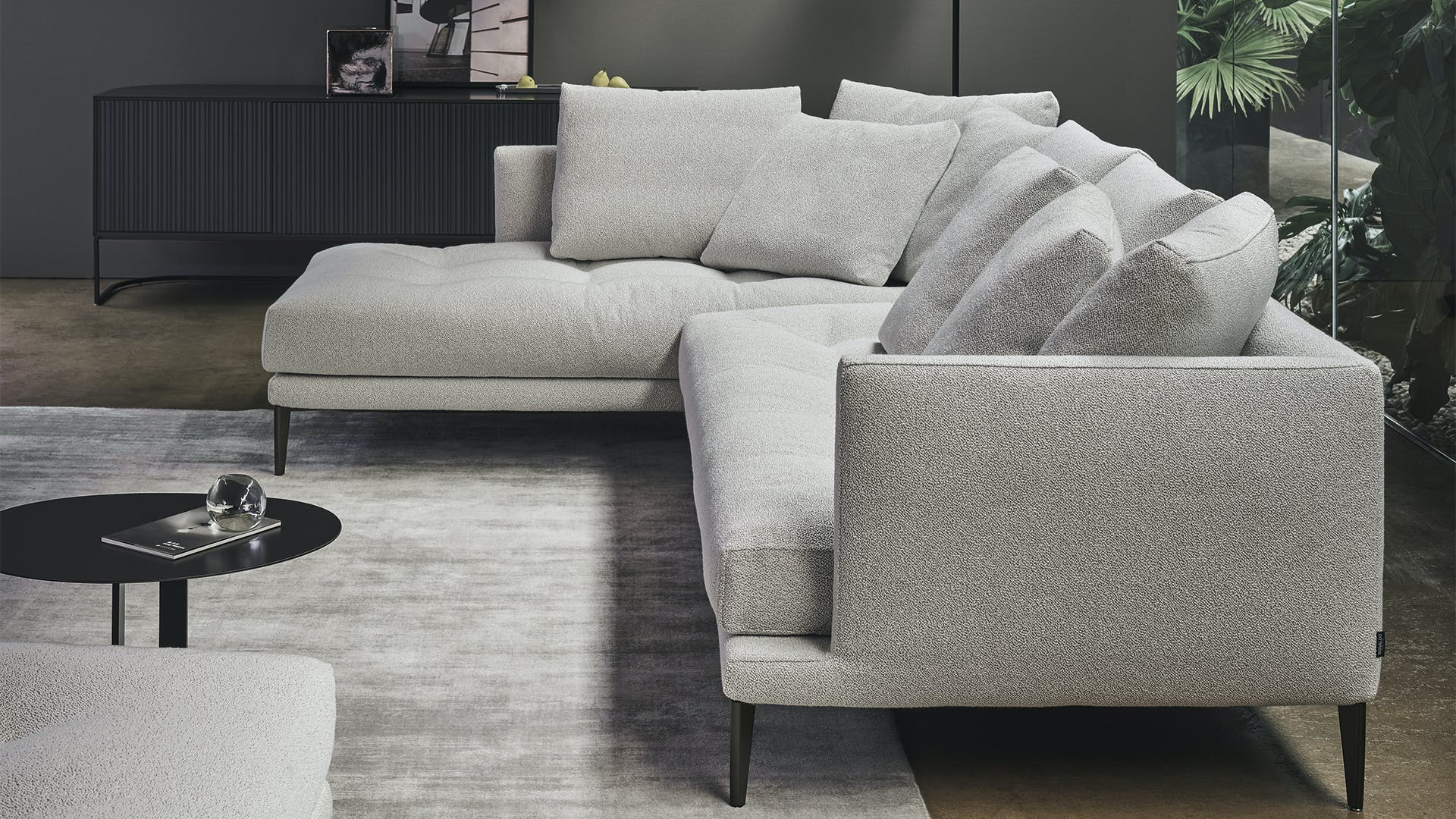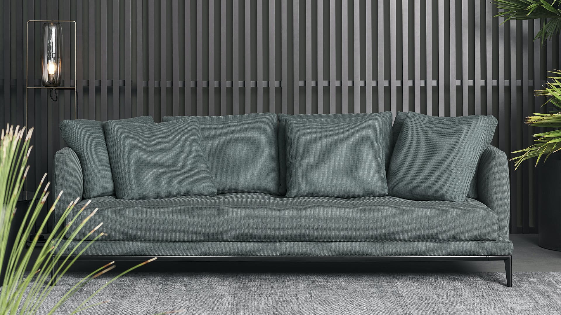 With its slender and minimalist overall image, the Soft Island contemporary sectional modern sofa represents comfort and refuge: with a deep seat, accompanied by a generous amount of cushions, it offers a way of sitting on the sofa that is always customisable. It is possible to choose between several solutions, with linear sofas, poufs, and compositions with corner pieces and chaise longues. The wide body of the Soft Island sofa, with its clean and rigorous lines, accommodates a single long seat cushion, made with stitching that gives movement and elegance. The contrast with the numerous backrest cushions paradoxically enhances the perception of formal simplicity and composed comfort. Soft Island is also available with a metal frame that de?nes the base of the sofa, giving an extra touch of re?nement and elegance. The upholstery of the Soft Island collection is completely removable and is available in fabric or leather. The subtle metal feet slim the composition and lighten its overall image.