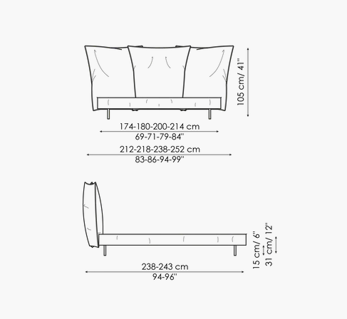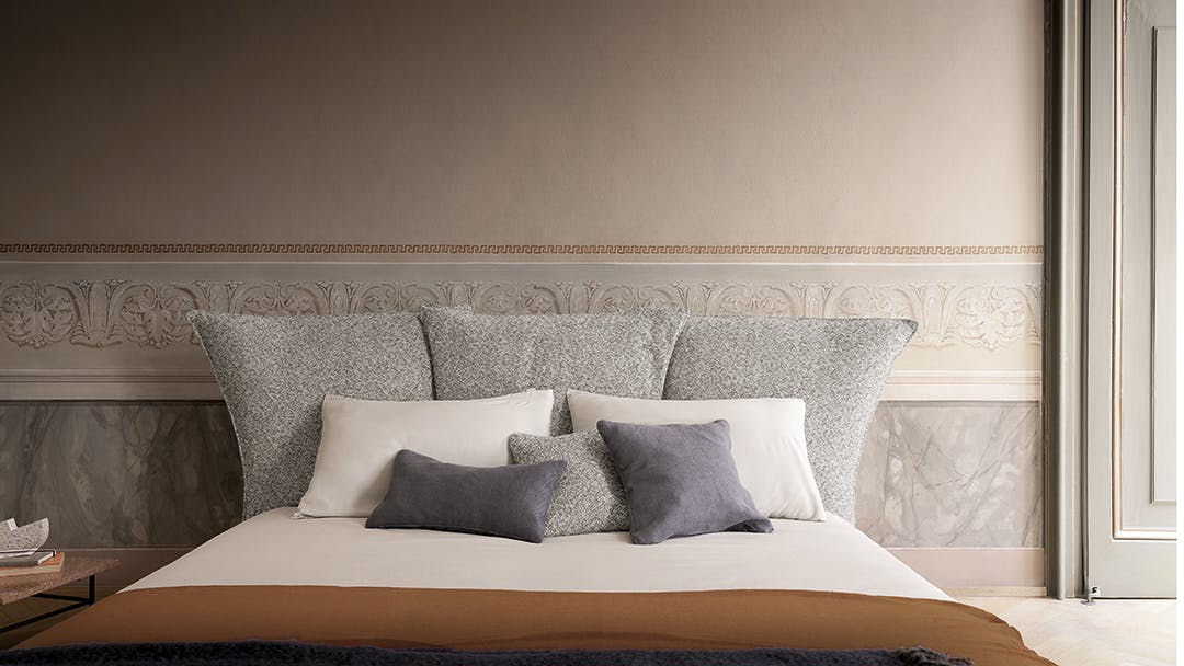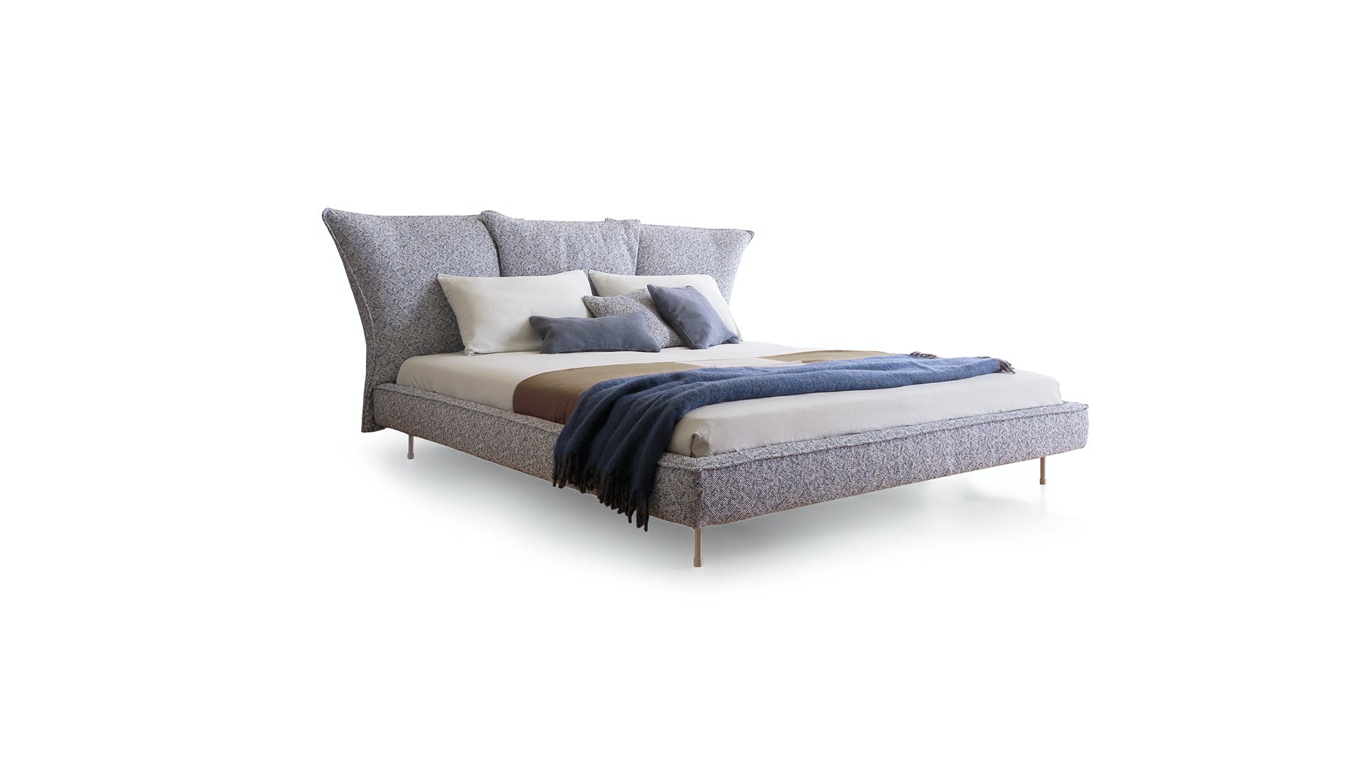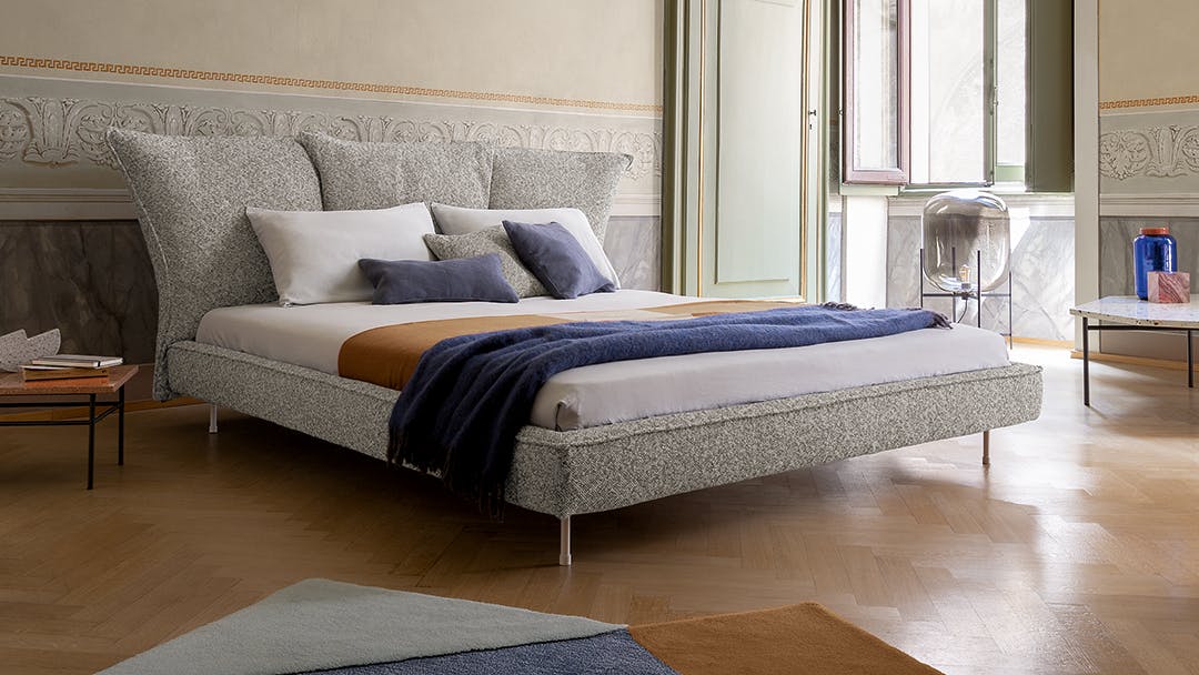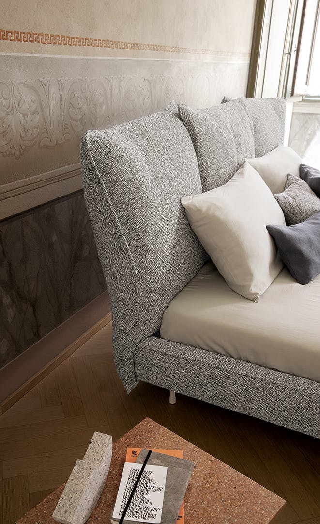 Madame C bed: the name is a tribute to Coco Chanel, who inspired its sophisticated and surprising taste. The modern headboard is made up of three large and slightly overlapping cushions, which mark out the perimeter of an authentic oasis of relaxation, able to ensure comfort without sacrificing formal elegance. The Madame C modern bed with headboard is held above the ground by thin tubular feet in painted metal, available in numerous colour variations. With a completely removable cover in fabric, leather or eco-leather, the Madame C bed is also available in a version with a thicker bed frame and low feet (Madame C Bed plus). In the Madame C Bed plus open version, thanks to the practical storage area, valuable additional space is provided for storing covers, cushions and everything necessary for the bedroom.