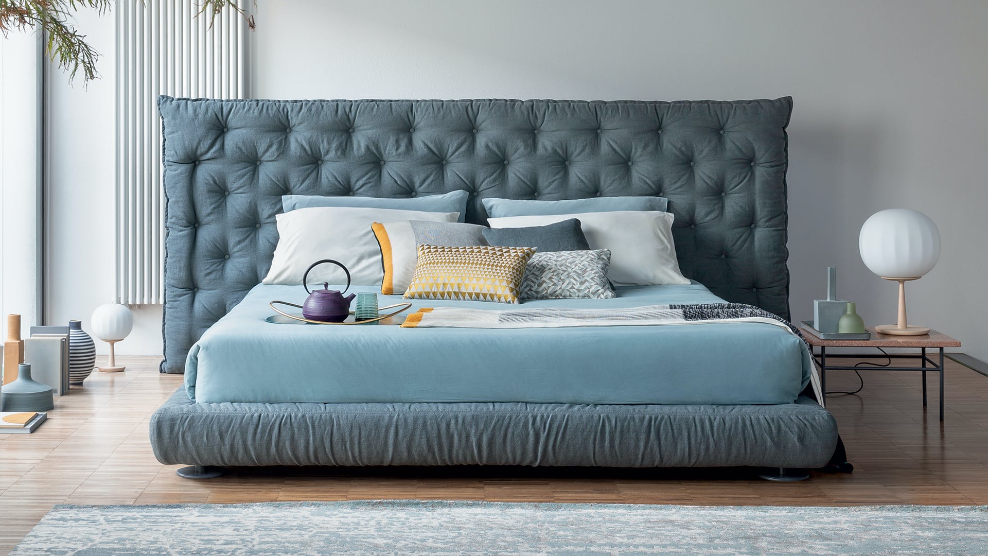 Full Moon is a double design bed with an opulent headboard that, with its sophisticated capitonné padding, frames the bed and provides a sense of abundance and softness, underlined by the draped bed frame. The version with the higher headboard (Full Moon hi) is also available with storage space (Full Moon hi open), which provides additional space for storing covers, cushions and everything necessary for the bedroom. Additional distinctive details are the painted metal circular feet, available in a series of colour variations. This bed, the name of which recalls the night, and specifically an evocative full moon, is the perfect companion for encouraging the sweetest and most relaxing dreams.