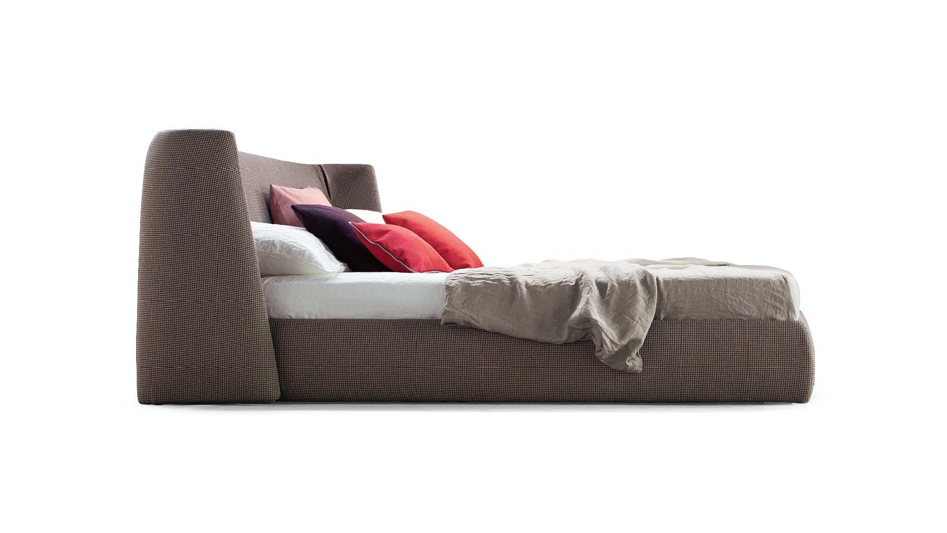 The Basket unique bed headboard has been designed by calibrating large shapes with soft, enveloping lines. This double bed is covered in fabric, leather or eco-leather, completely removable. There are many variations to the design: in addition to Basket, there is the Basket plus model, featuring sophisticated tucks on the headboard; Basket high, which displays the sophistication of the volumes, thanks to the more imposing headboard; Basket air, whose painted metal feet have slender elegant lines and the Basket air plus, with metal feet and headboard embellished with tucks. The Basket, Basket plus and Basket high are also made in the “open” version: the practical unit provides valuable additional space for storing covers, cushions and everything necessary for the bedroom.