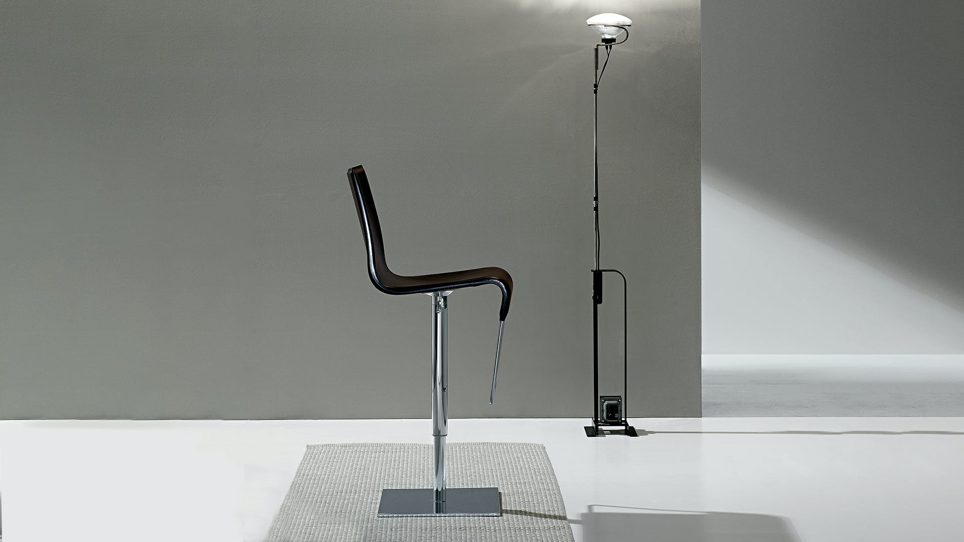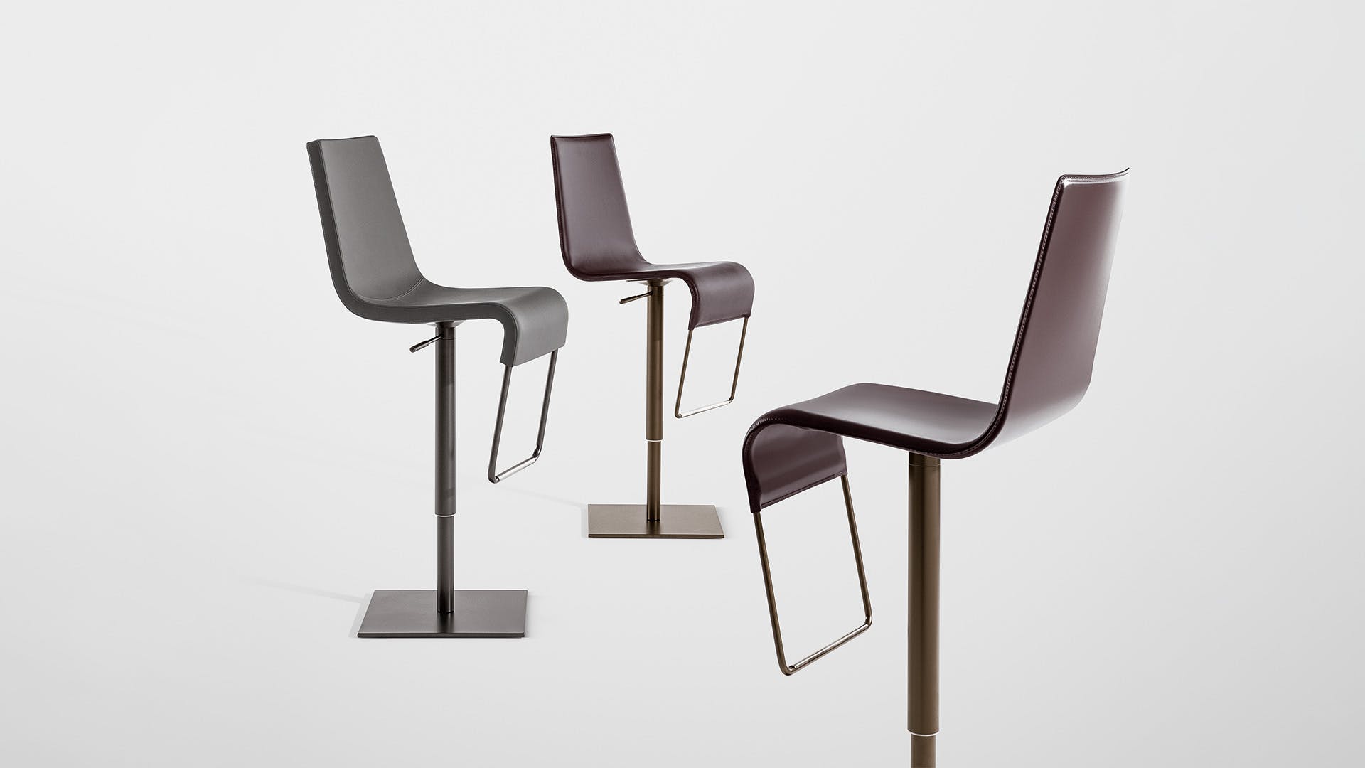Skipping is a swivel stool with backrest that offers an adjustable height thanks to a robust piston mechanism. Available with upholstery in eco-leather, leather or emery-leather, it is particularly comfortable thanks to the sinuous shapes of the seat, with cold foamed polyurethane padding. The structure and the footrest are made of matt painted metal or chrome-plated steel. With its understated, curvilinear but minimalist line and design by Karim Rashid, Skipping is welcoming and comfortable and integrates perfectly within original environments, characterised by sophisticated atmospheres. A flexible, extremely pure and contemporary sign: an original and fascinating object that as the dominant character in any space with its agile and dynamic presence, appears comfortable and inviting right from the first glance.