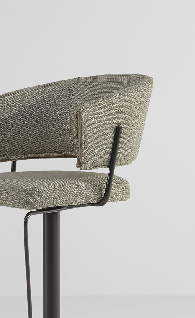 The Bahia too stool with backrest is the result of the combination of curved shapes and simple tubular metal elements, giving as a result an extremely balanced aesthetic. Available with swivel or fixed base, Bahia too is the ideal stool for furnishing both residential and contract spaces. The curved backrest allows free support of the arms and generously wraps the back. Bahia too is covered in fabric, eco-leather or leather.