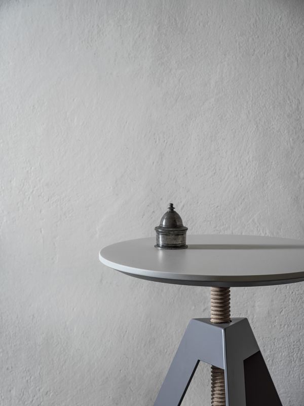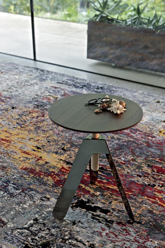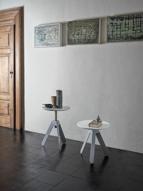 Coffee table with adjustable height. Screw in solid Wood ash. Metal lacquered frame. Top in veneer or lacquered Wood.