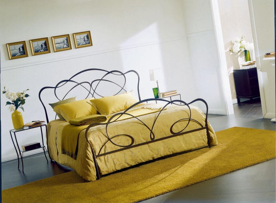 Iron bed in lacquered or hand-coated metal frame, in double version, with footboard, bed ring or storage unit.