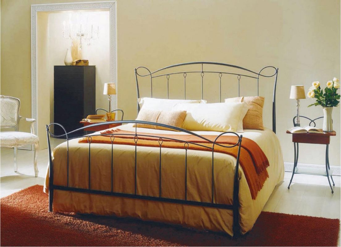 Iron bed in lacquered or hand-coated metal frame, in double version, with footboard, bed ring or storage unit.