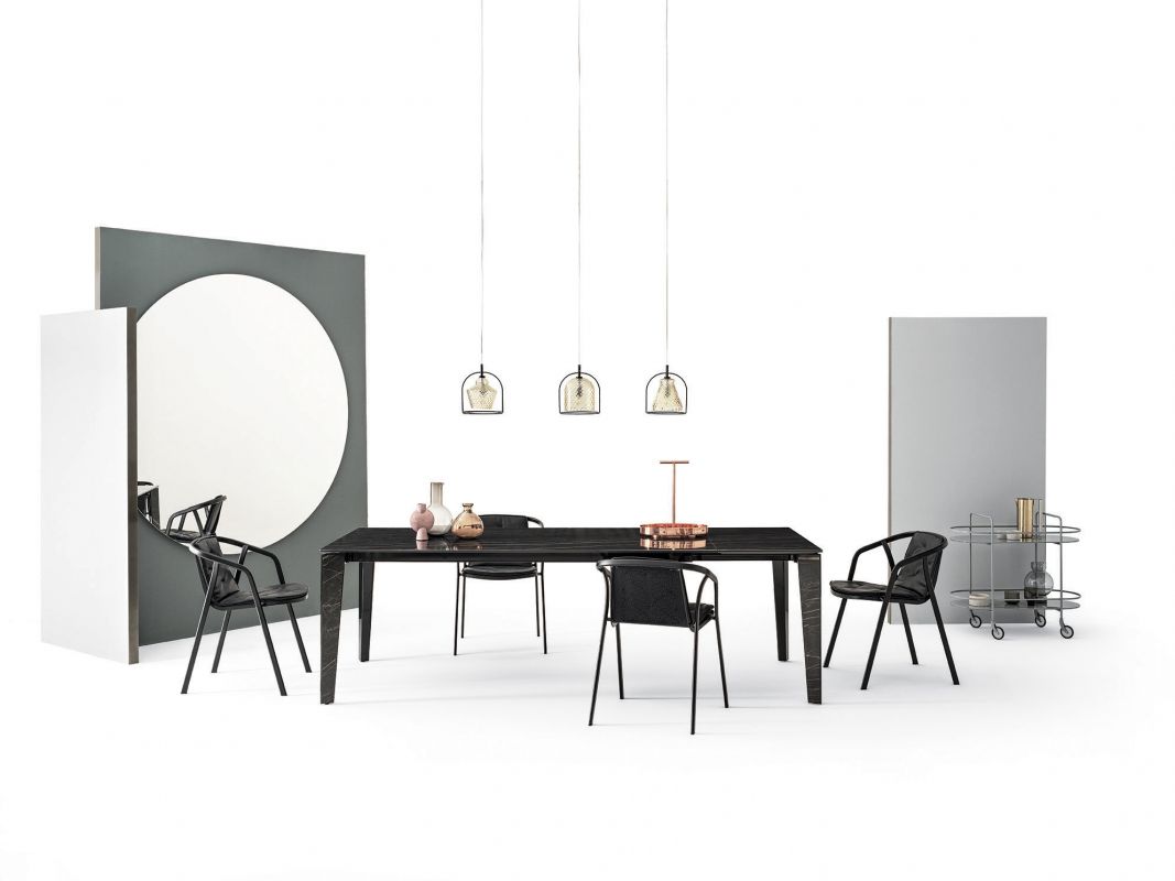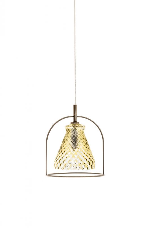 Ceiling light with chromed celiling rose and transparent cable. Laquered metal frame. Hand floating glass.
