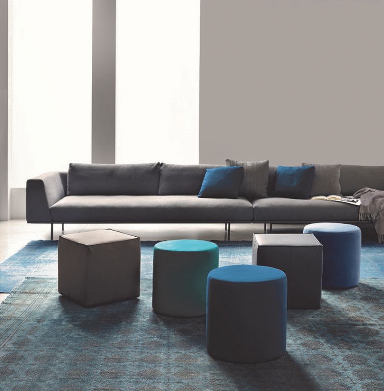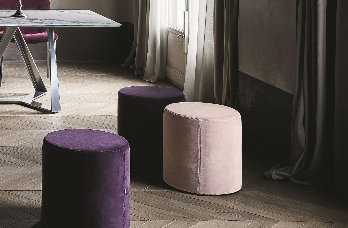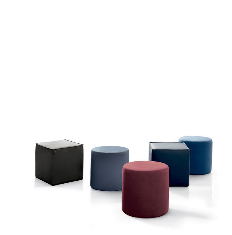 Pouff imbottito e rivestito in Pelle Ecologica, Waterproof Nabuk, Waterproof Nabuk stampato o Pure Virgin Wool.