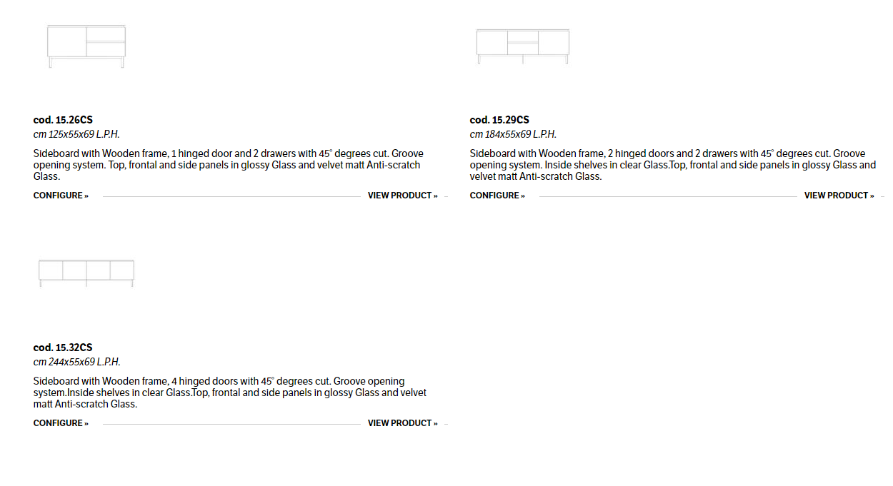 Wooden storage unit available with doors, drawers, baskets or open spaces. Groove opening system. Inside shelves in clear Glass. Top, frontal and side panels in glossy Glass and velvet matt Anti-scratch Glass.