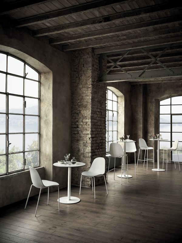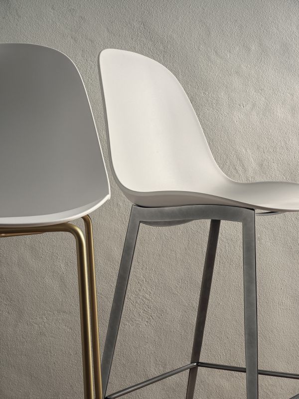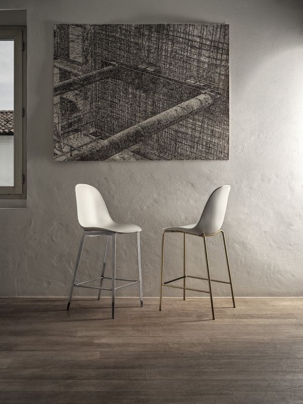 Barstool with lacquered Metal frame round section and triangular legs, shell in polypropylene.