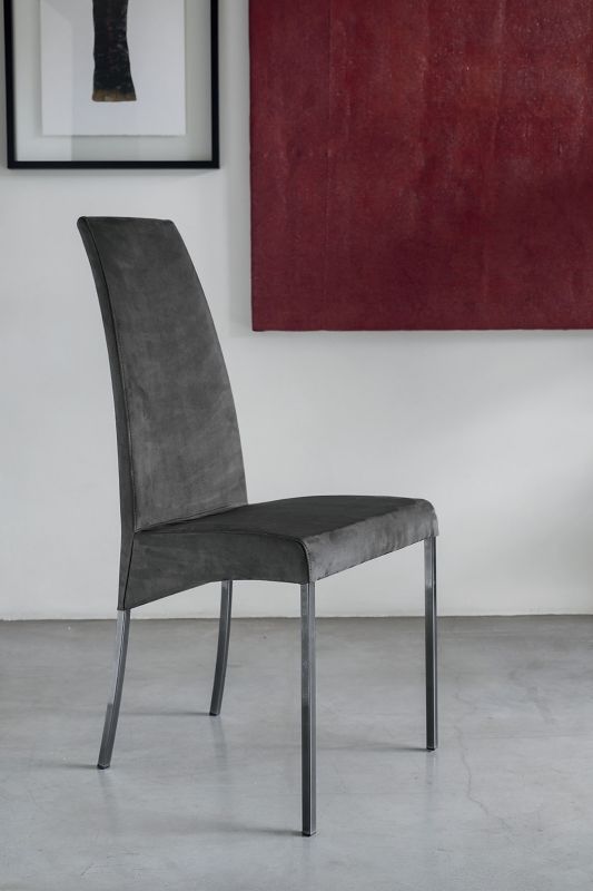 Chair with lacquered or chrome Metal frame. Seat and back padded and upholstered in Eco Leather, Technical velvet, Mambo and Lulù fabric, Technical velvet, Waterproof Nabuk, Waterproof printed Nabuk, Pure Virgin Wool, Velvet, Decò fabric and Premium Nappa Leather.