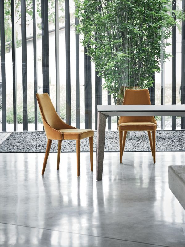 Chair padded and totally upholstered or with the legs in lacquered Metal frame. Piping can be in matching colour or contrast colour. Also available in the version with quilted backrest (only for Waterproof Nabuk, Eco leather and Premium nappa leather).