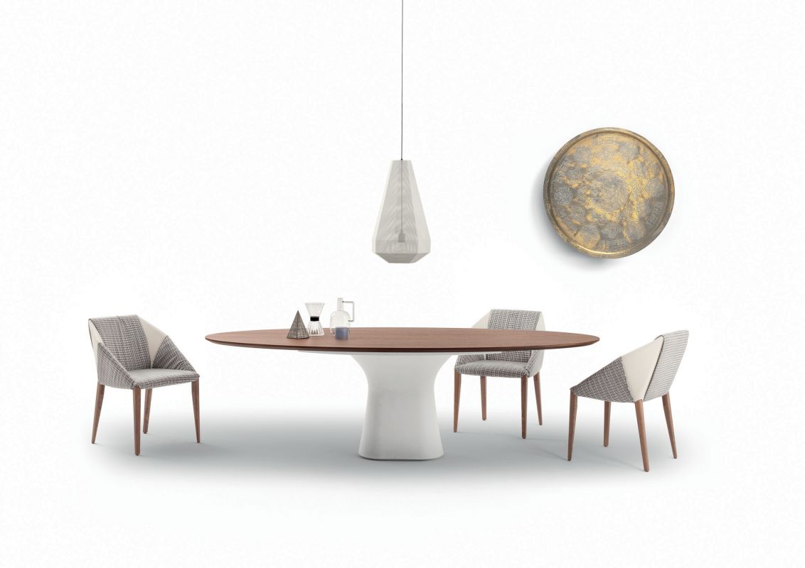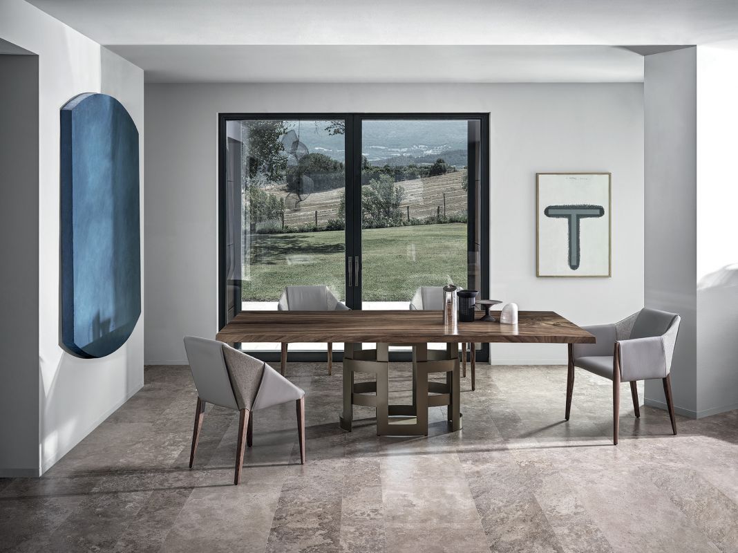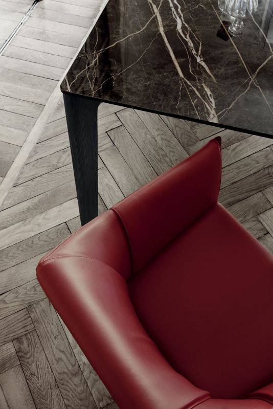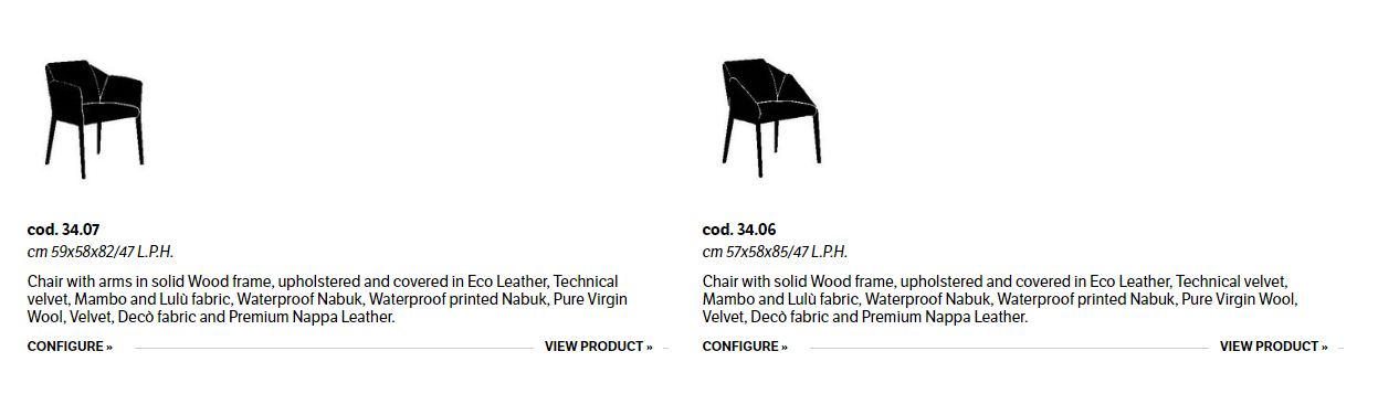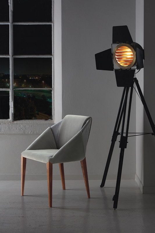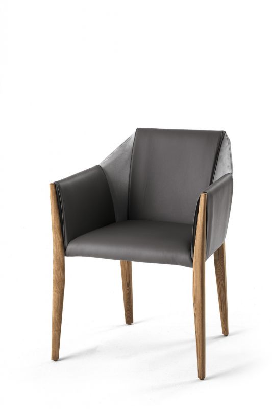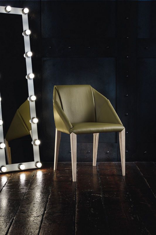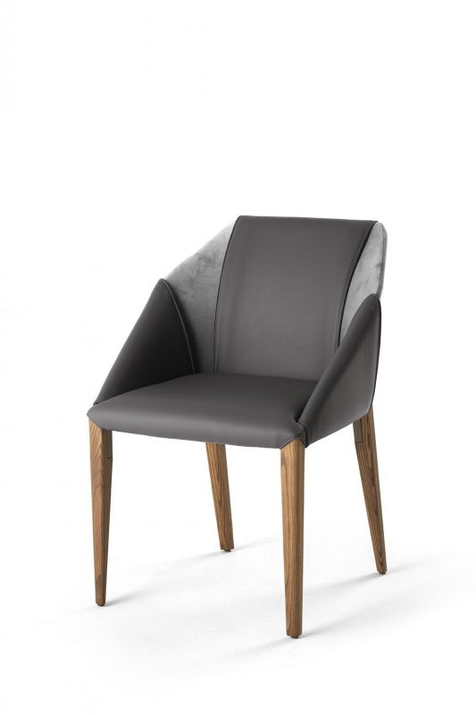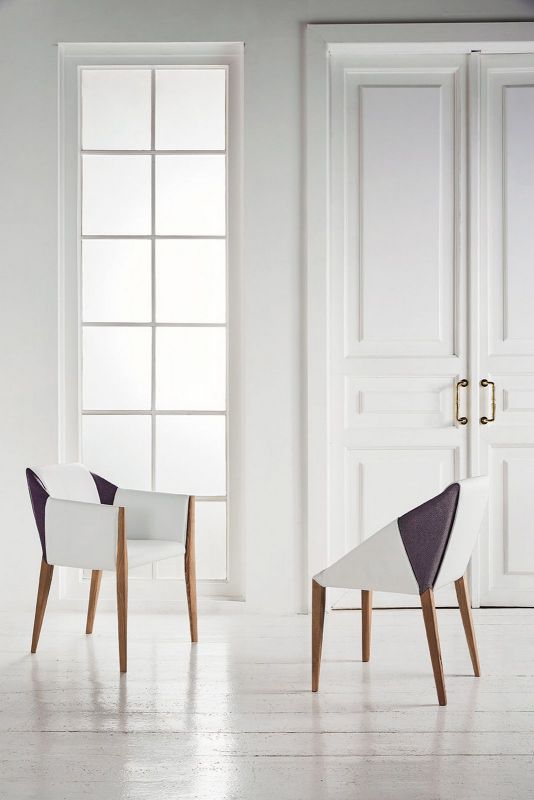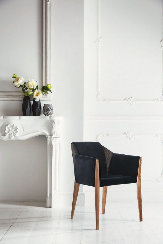 Chair and chair with arms in solid Wood frame, upholstered and covered in Eco Leather, Technical velvet, Mambo and Lulù fabric, Waterproof Nabuk, Waterproof printed Nabuk, Pure Virgin Wool, Velvet, Decò fabric and Premium Nappa Leather.