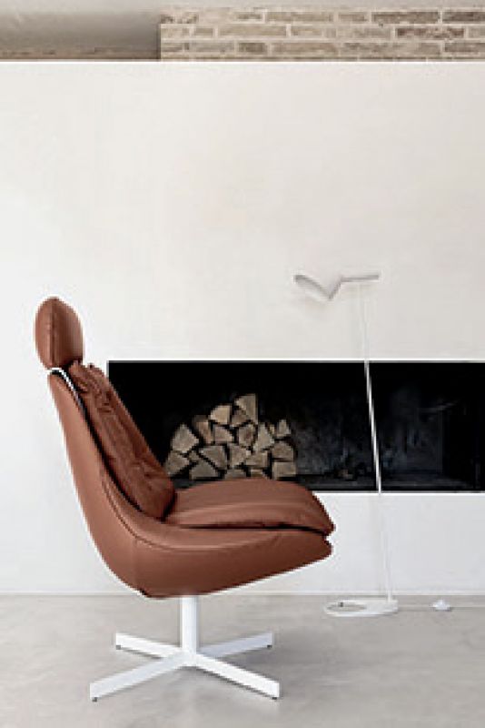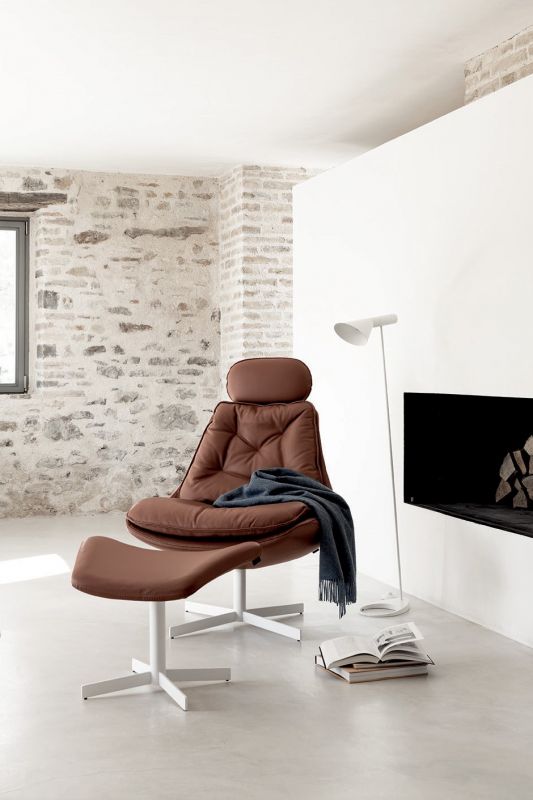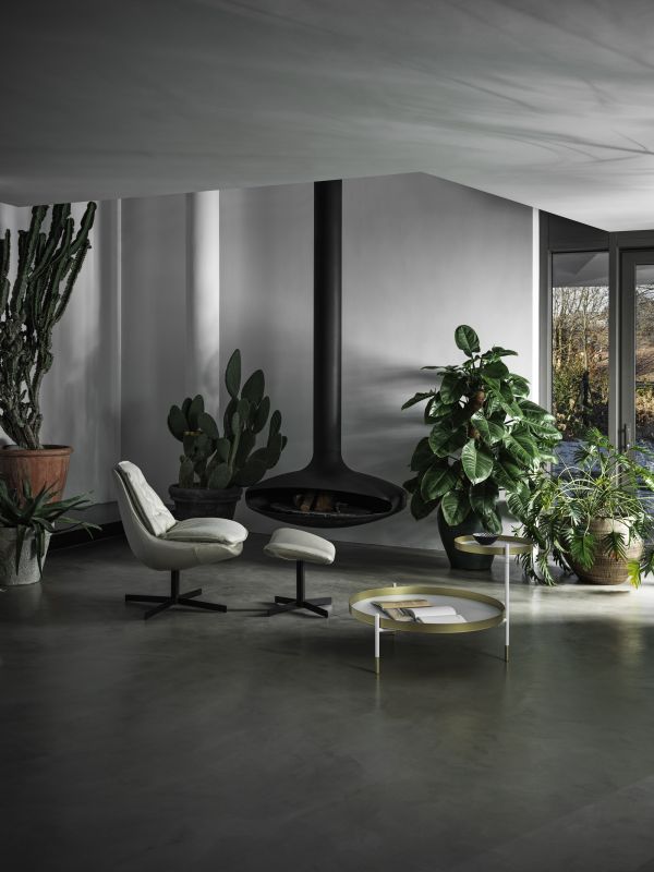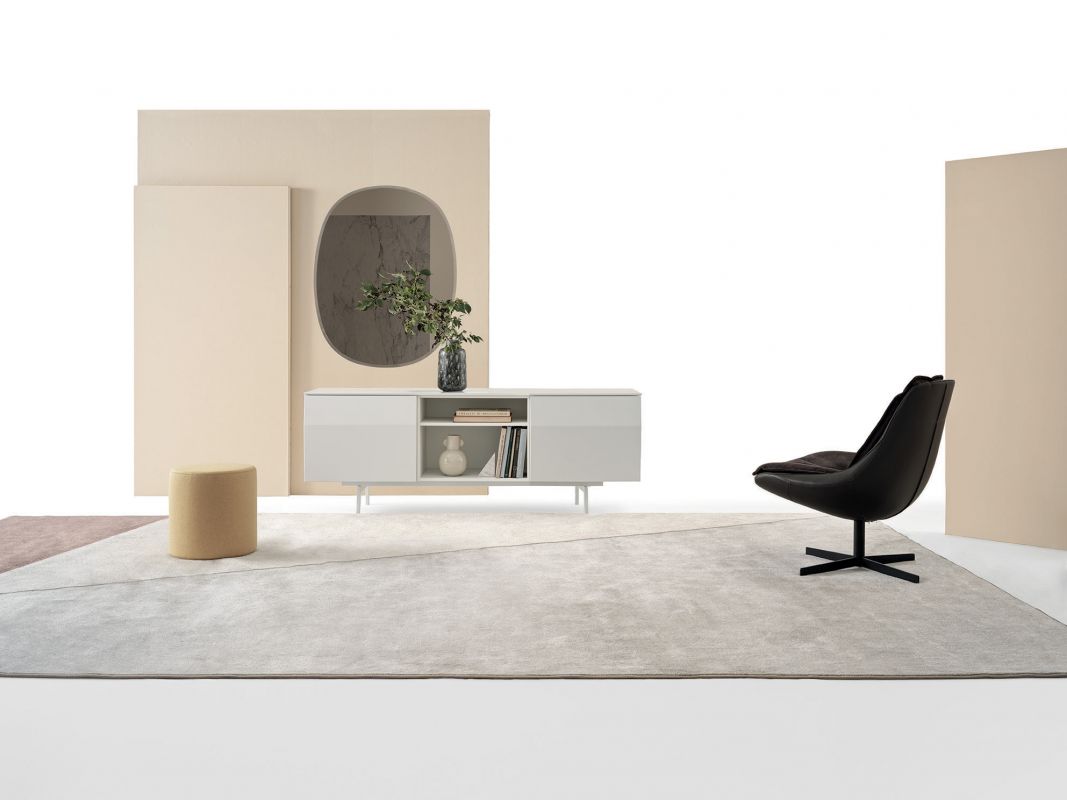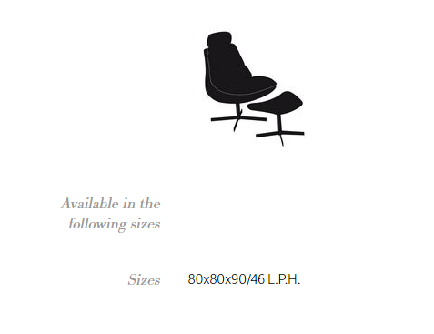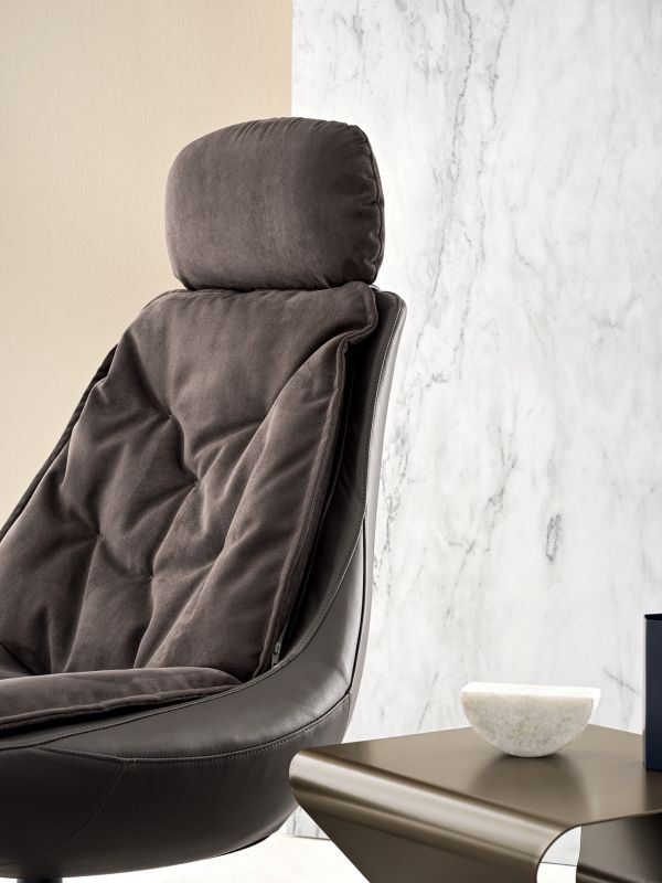 Armchair with swivel base in chrome or lacquered Metal, shell in fire retardant cold foamed polyurethane with a Metal insert. Back and sitting cushions in self-binding Fibre, with removable cover in Eco Leather, Technical velvet, Mambo and Lulù fabric, Waterproof nabuk, Waterproof printed nabuk, pure virgin wool, Velvet, Kvadrat Field fabric, Kvadrat Coda fabric and Premium Nappa Leather.