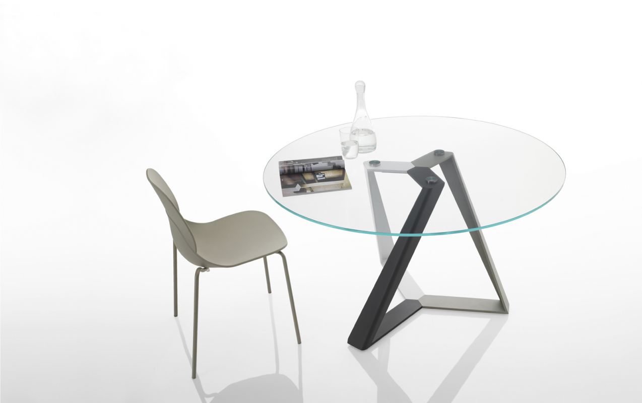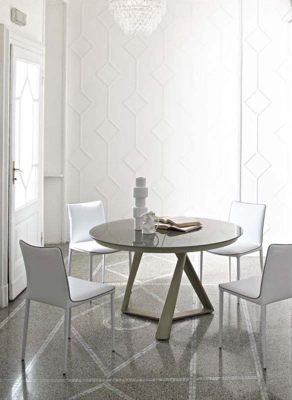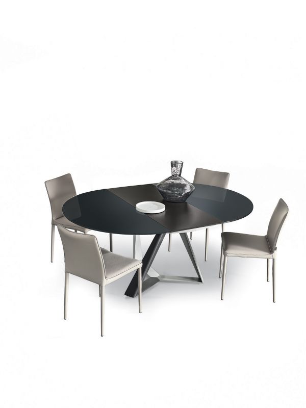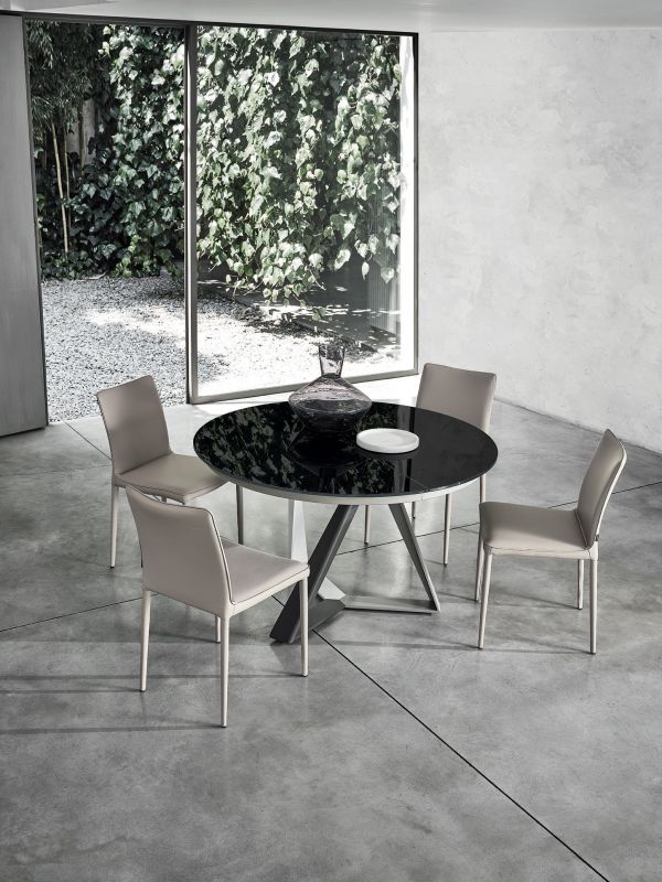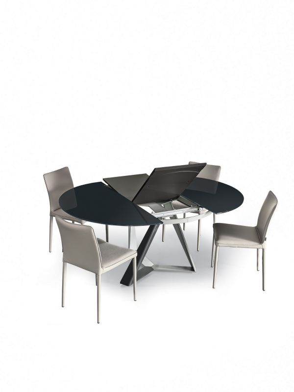 Round table fix or with extensions, with lacquered Metal frame. Top in veneer, glossy Glass, velvet matt Anti-scratch Glass or SuperMarble.