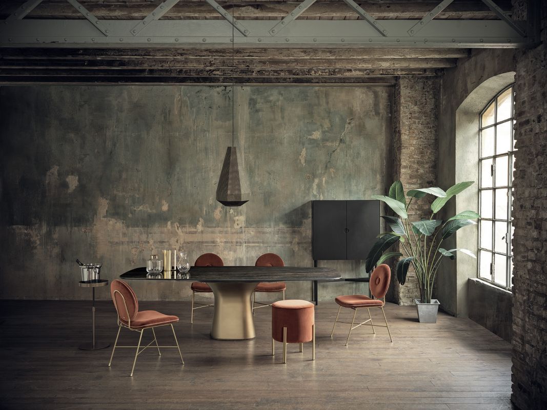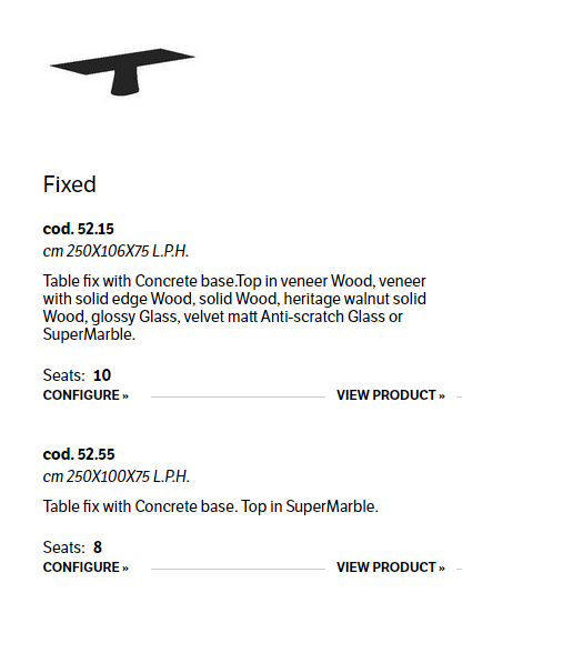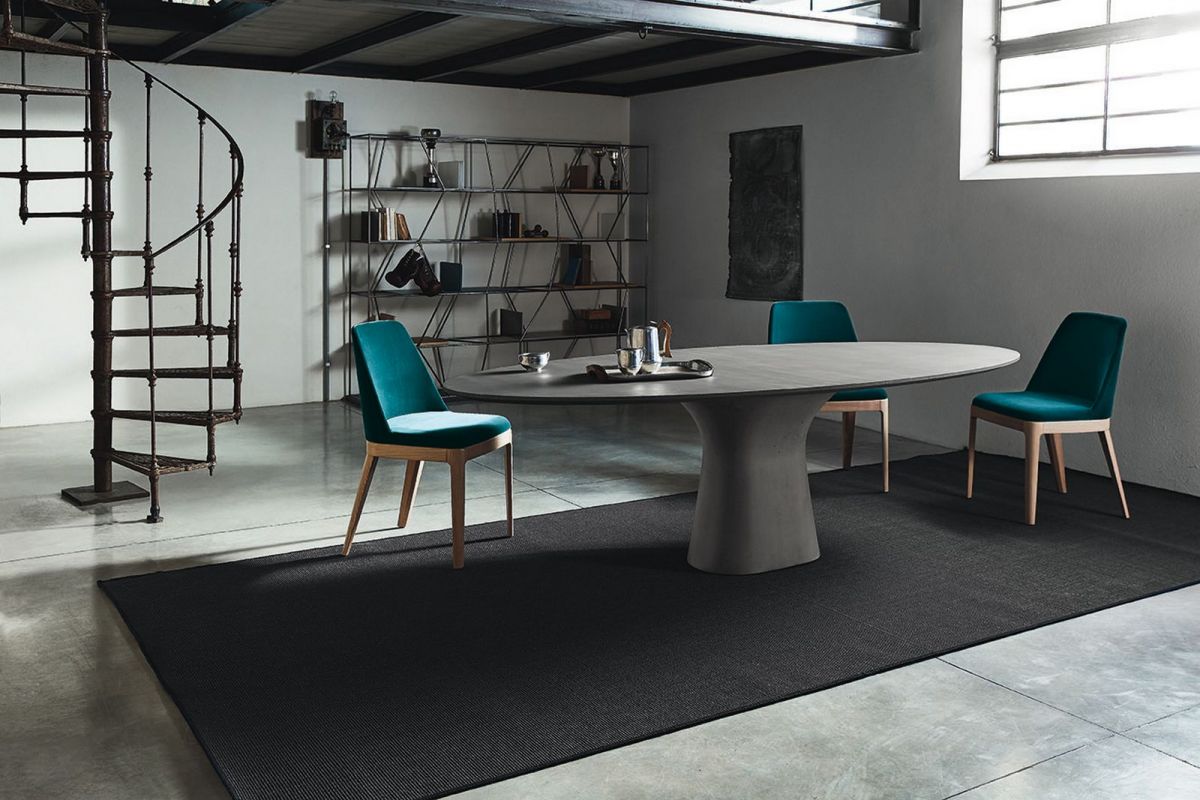 Table fix or with extensions and with Concrete base. Top in veneer Wood, veneer with solid edge Wood, solid Wood, heritage walnut solid Wood, glossy Glass, velvet matt Anti-scratch Glass or SuperMarble.
