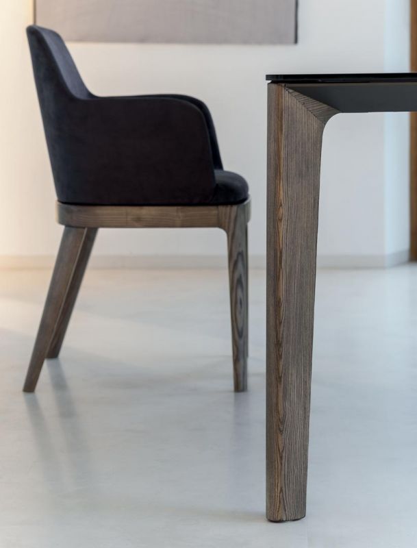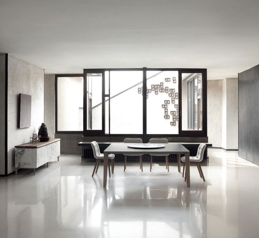 Table fix or with extensions with metal frame in matching colours with top finishing, solid wood legs. Top in lacquered wood, glossy glass and velvet matt anti-scratch glass.