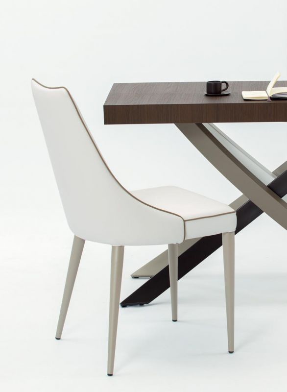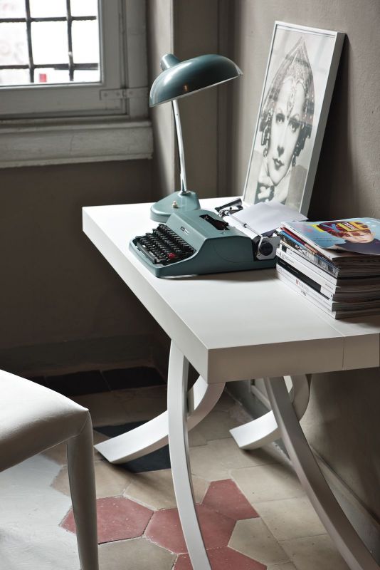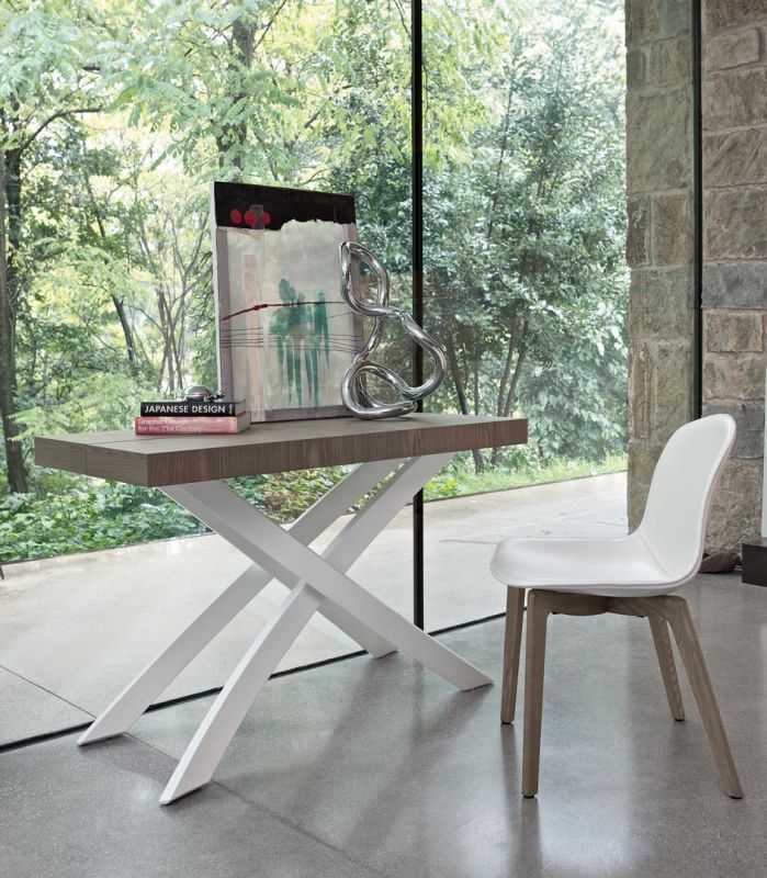 Console with lacquered Metal frame, top and extensions in veneer or lacquered Wood.