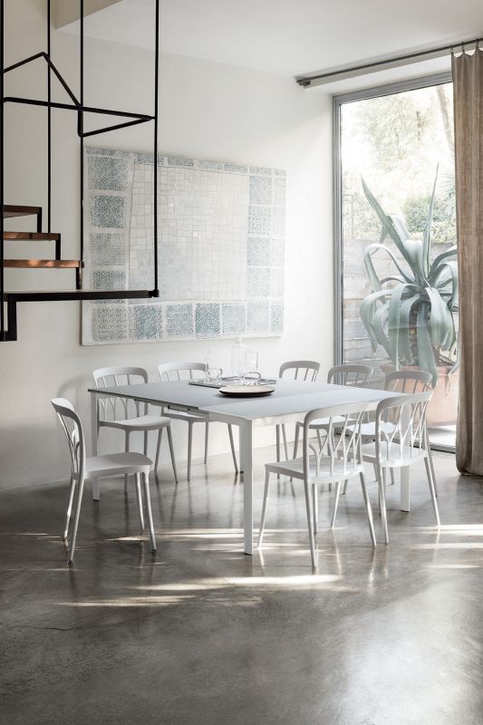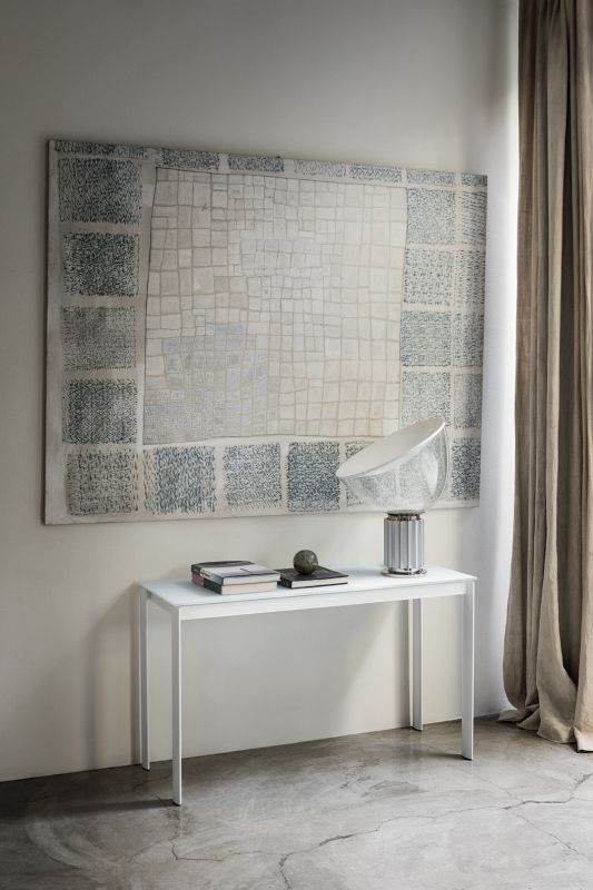 Console with lacquered or chrome Metal frame, top in glossy Glass or velvet matt Anti-scratch Glass and extensions in melamine aluminum.