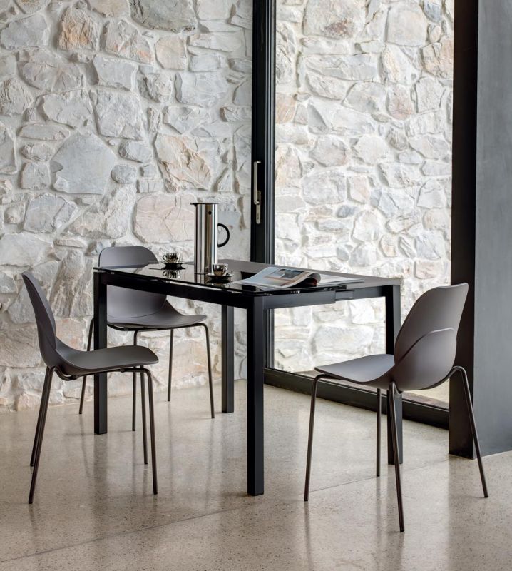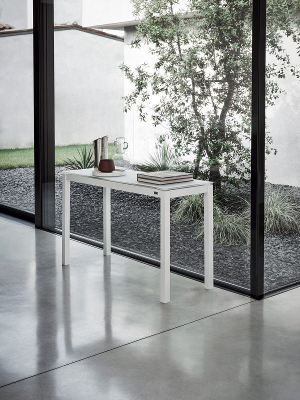 Console table with extension and lacquered Metal frame. Top in glossy Glass or velvet matt Anti-scratch Glass.