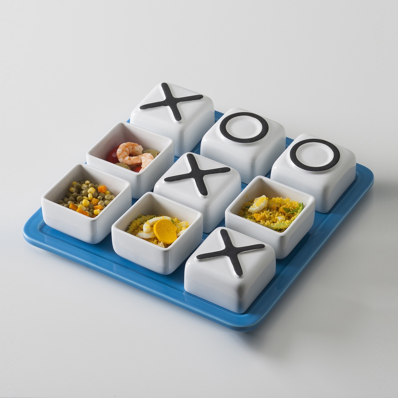 Tris è composto da 1 vassoio e 9 ciotoline in ceramica. Ideale come antipastiera, ma anche come raccoglitore di piccoli oggetti in ufficio come in casa. Una volta capovolti i 9 contenitori e riposti sulvassoio, Tris si trasforma nell'omonimo passatempo con cui giocare ed intrattenere gli amici.