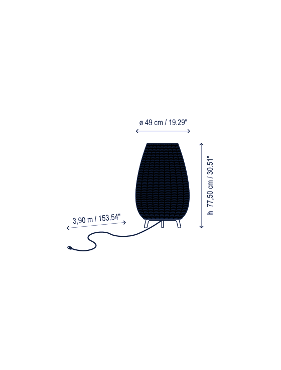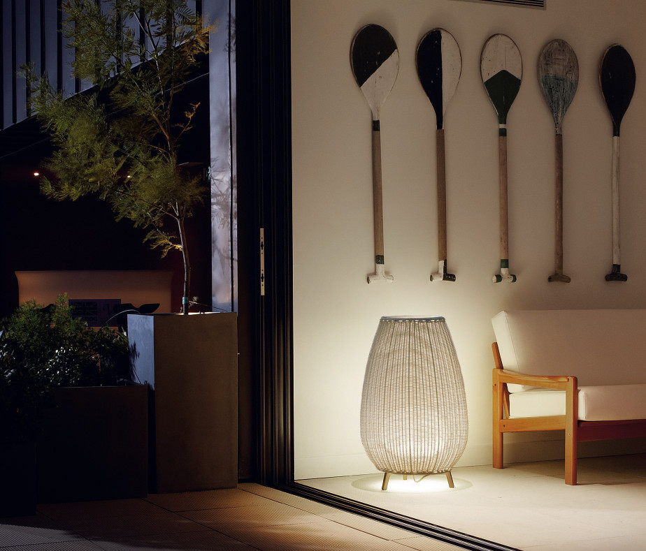 The AMPHORA collection has been designed to create a warm environment especially in outdoors. However, thanks to its highly decorative look, the Amphoras can equally be placed both in outdoor and indoor. The size and shape of this collection pay a subtle and discreet homage to the terracotta amphora formerly used for gardens and terraces decoration. In this collection we have used a synthetic wicker to make up big handmade baskets as shades with a tripod foot subjected to a cataphoresis treatment. The light source is located inside the polyethylene ellipse which grants its water tightness. The light emitted by the Amphora collection is full of nuances and shapes avoiding dazzling.
