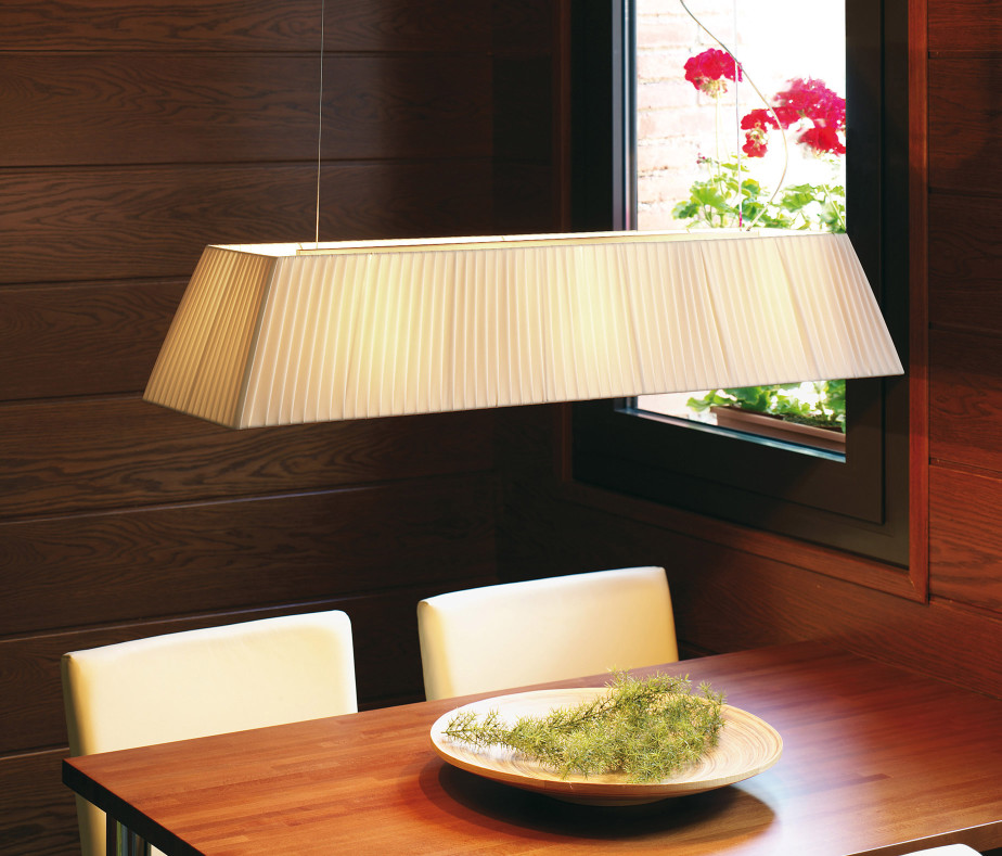 Mei is a pendant family composed of different shapes and lines but with a common denominator: the ribbon. The ribbon shades are entirely made in BOVER, starting with the frames welding to the ribbon process itself. This allows us to totally control the product quality, custom process and delivery terms. The Mei lamps are great for environments where a warm light is required. They mostly have a wide diameter, offering as a result a good direct light. Discrete and decorative since its mechanical structure is hidden inside the lamp, as if they were in a second place. Lamps are held by thin tensor wires that enhance its lightness. With Mei collection we have developed tailor-made lamps with important dimensions, and we have been able to make a quality packaging to ensure the shipment worldwide.