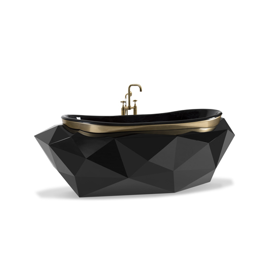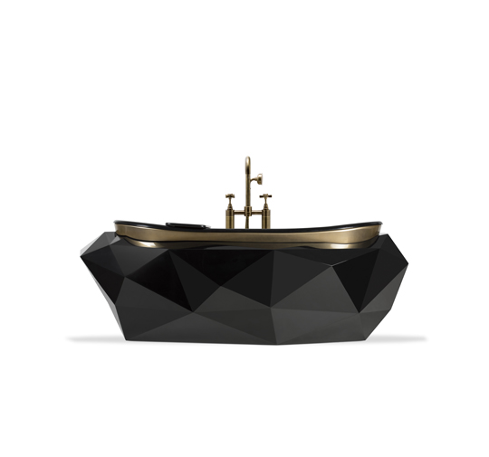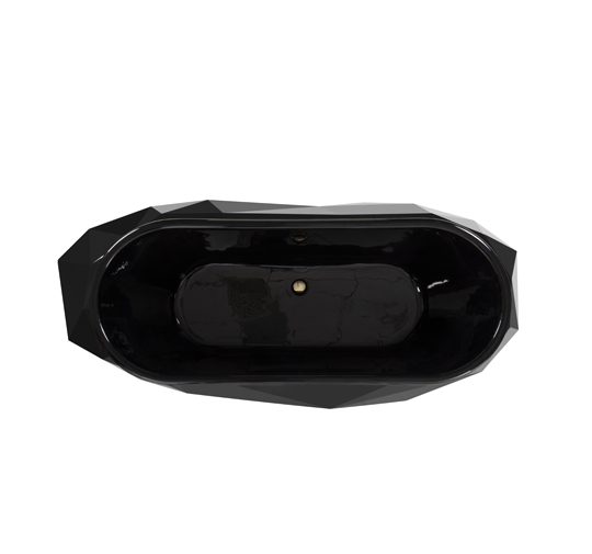 Diamond bathtub designed in fiberglass with a luxurious black high-gloss finishing. The diamond shaped sculptural body is based on its name, making it a exquisite item in any modern bathroom. This bathtub also presents a golden rim, a small detail that stands out.