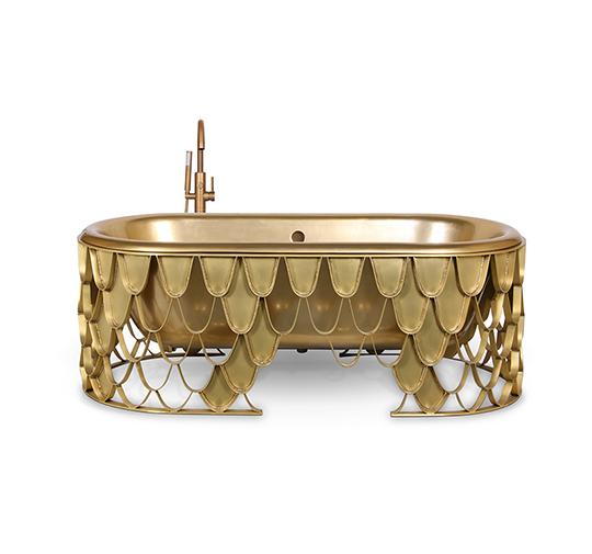 The Koi bathtub features a brushed brass matte base resembling the scales pattern of the Japanese Koi carp. The contrived patina iron tub has an oval shape and a curved lip, making it the perfect resting spot for your head. The name of this contemporary bathtub and the Japanese word for love are homophones, making the carp a symbol of love and affection.